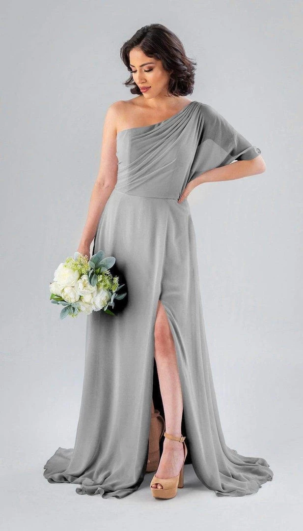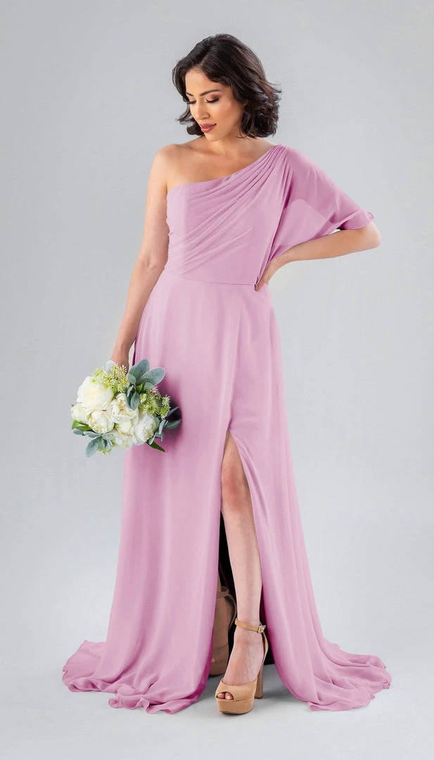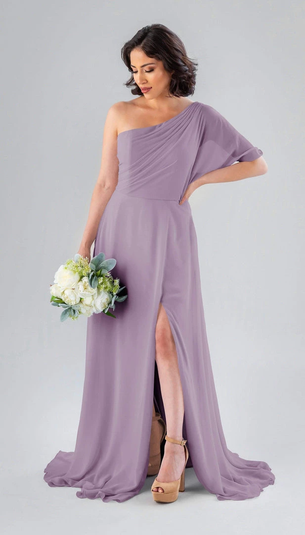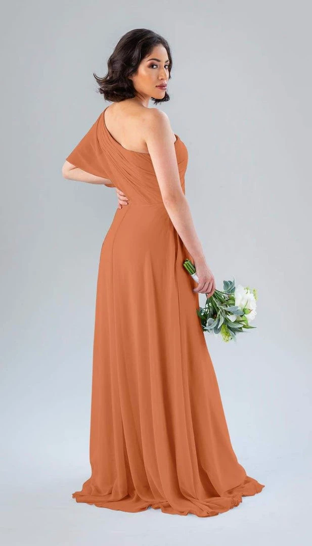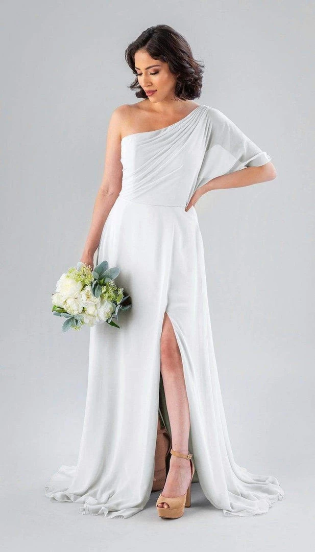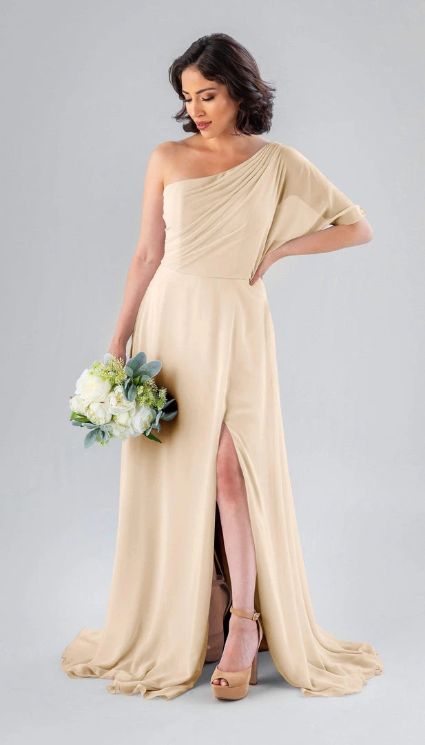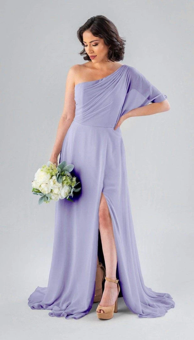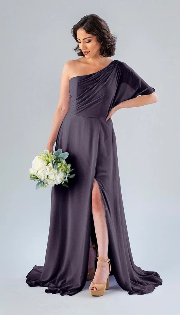 Kennedy Blue Blake is a gorgeous one-shoulder bridesmaid dress that features a short flutter sleeve for a romantic look. This flowy bridesmaid dress is flattering on a variety of figures.