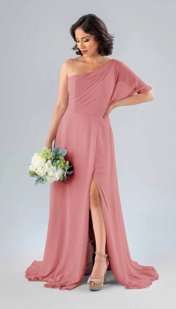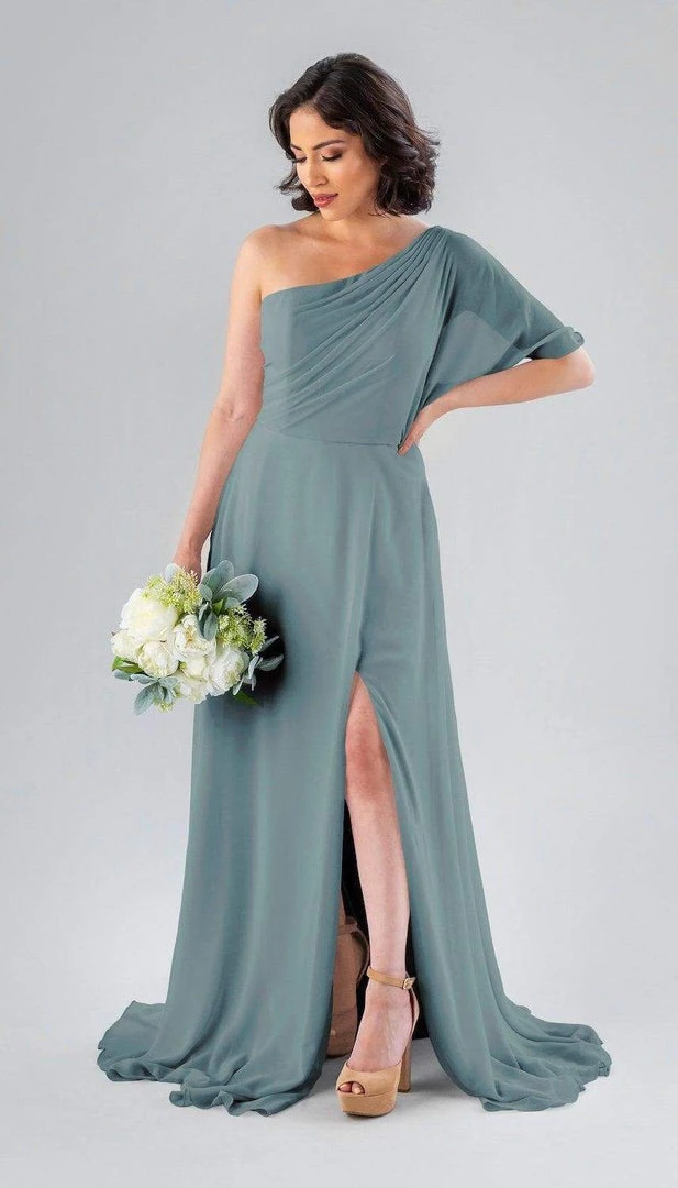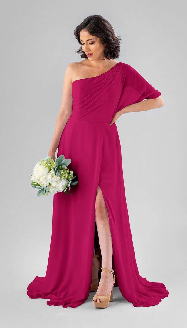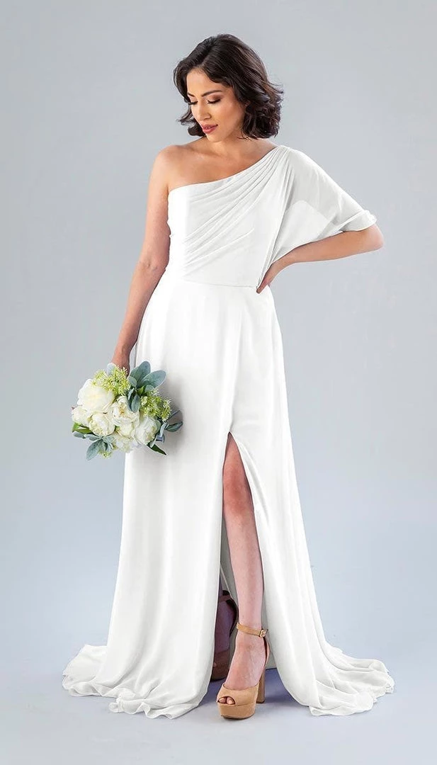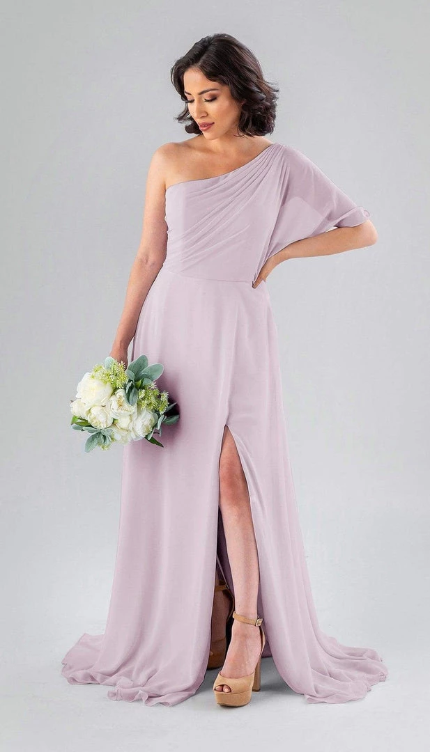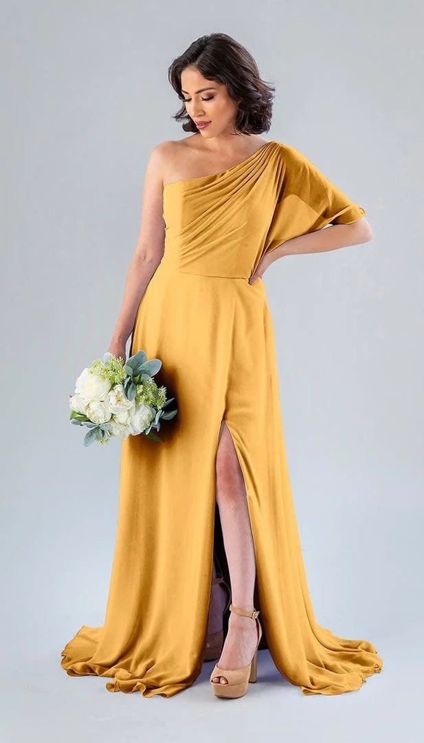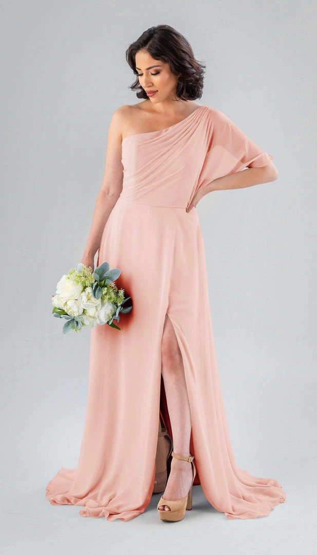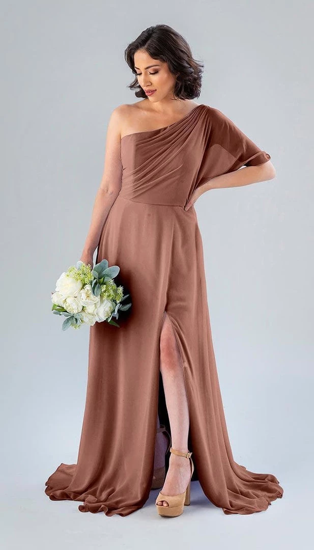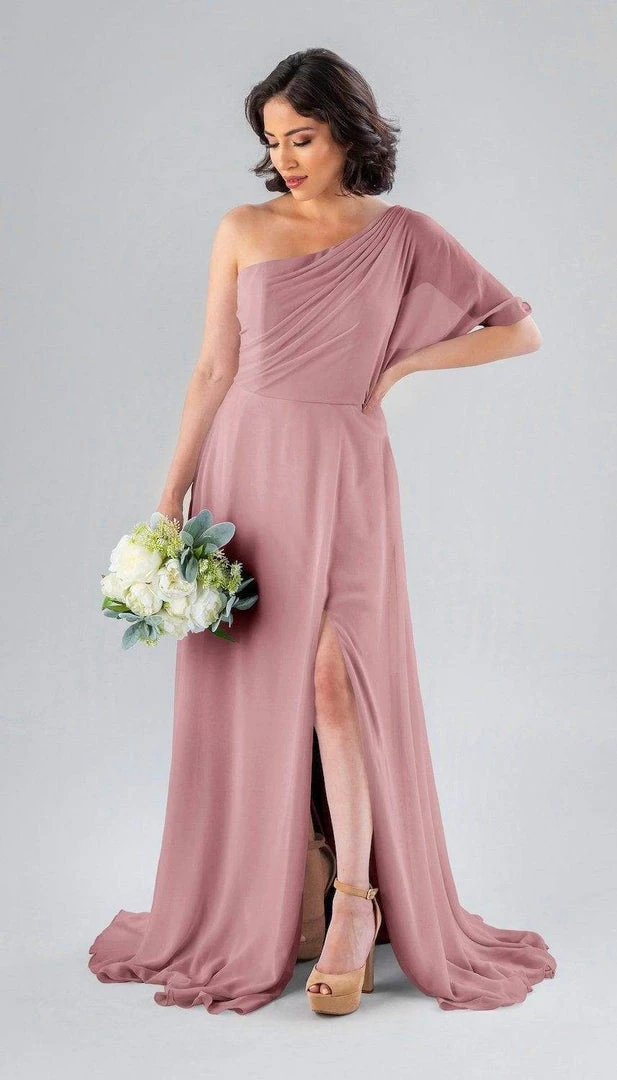 Kennedy Blue Blake is a gorgeous one-shoulder bridesmaid dress that features a short flutter sleeve for a romantic look. This flowy bridesmaid dress is flattering on a variety of figures.