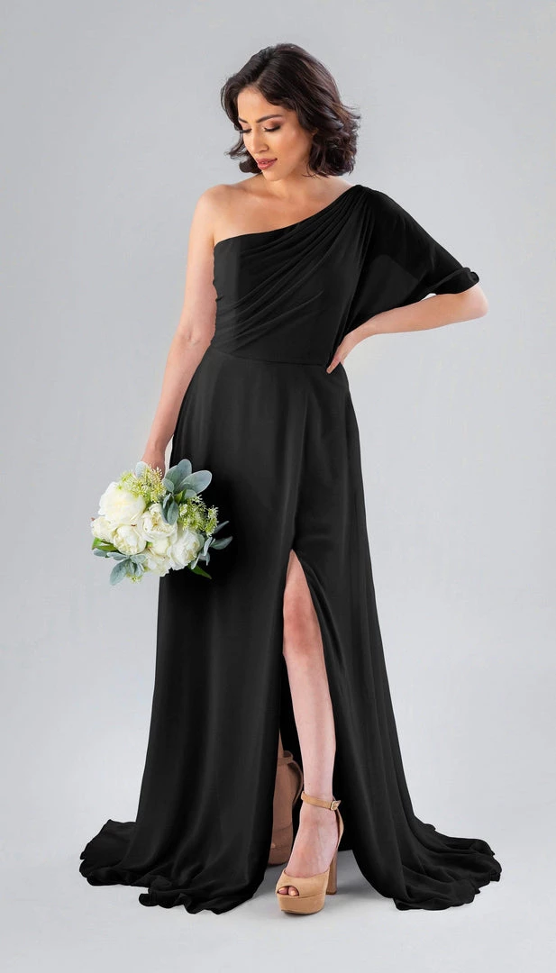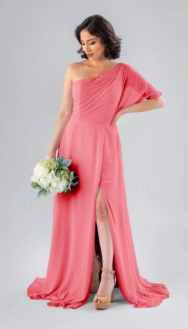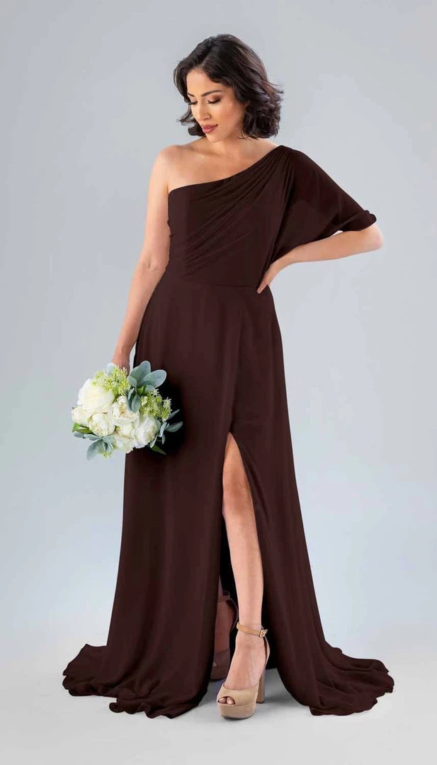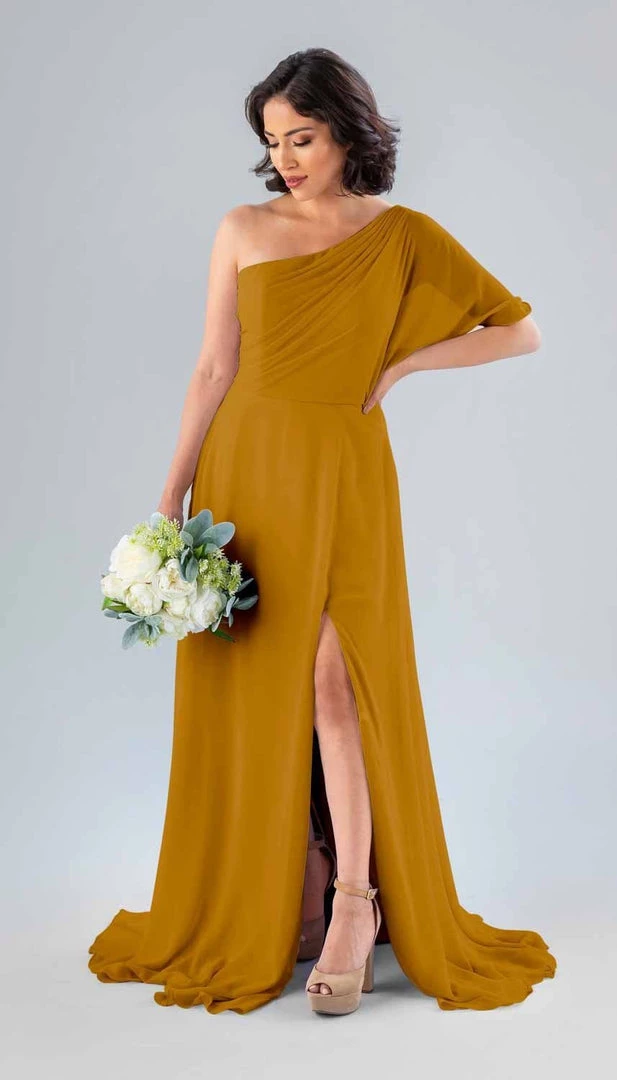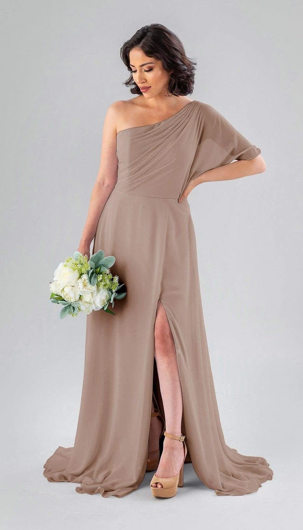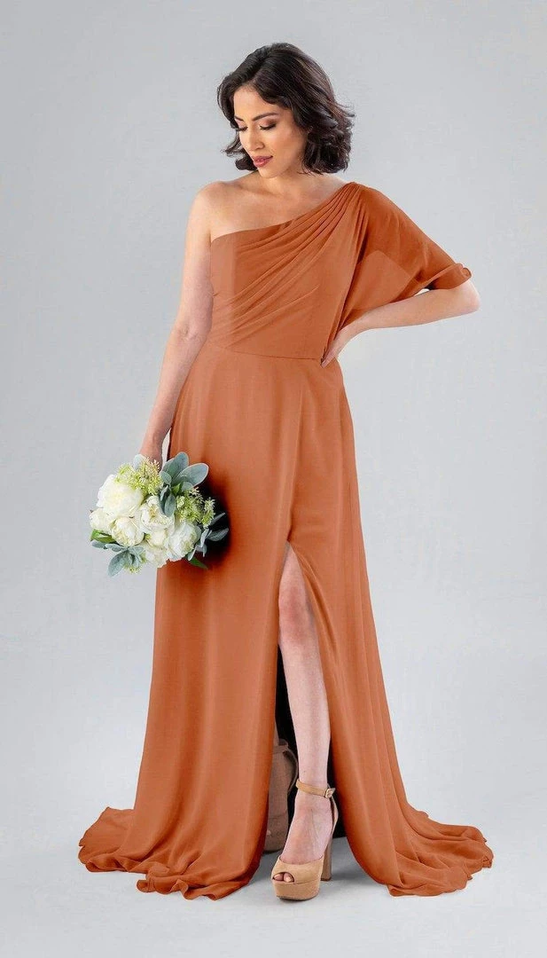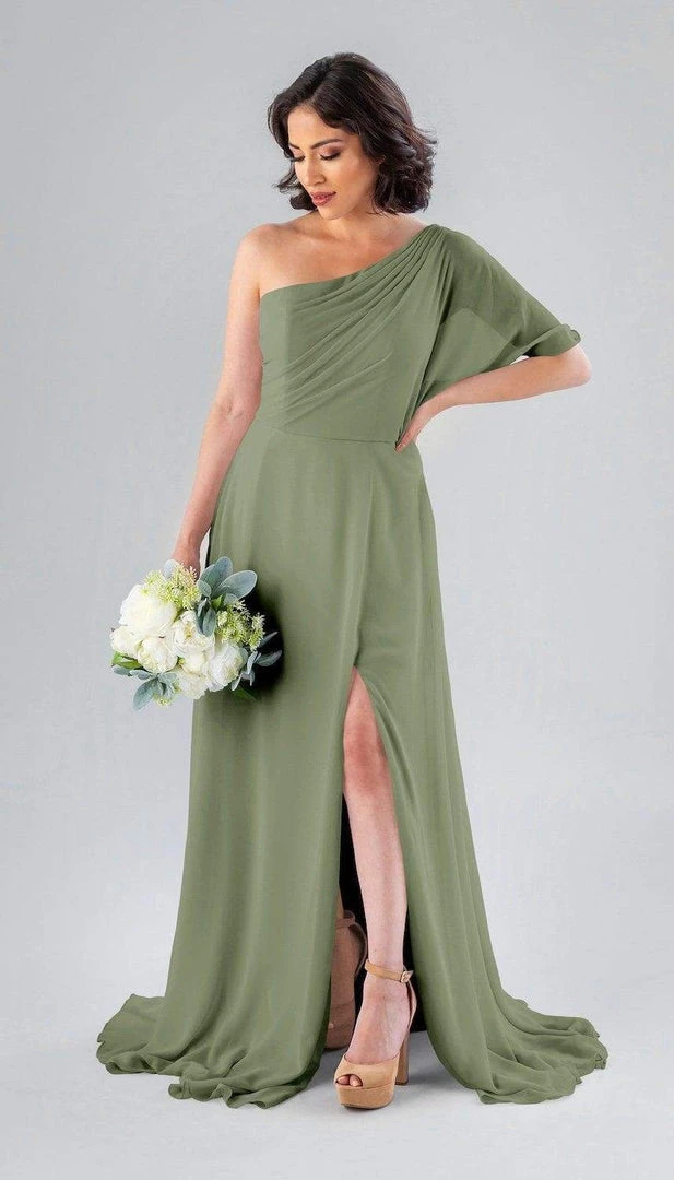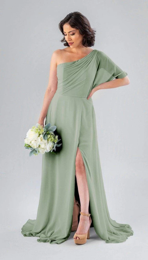 Kennedy Blue Blake is a gorgeous one-shoulder bridesmaid dress that features a short flutter sleeve for a romantic look. This flowy bridesmaid dress is flattering on a variety of figures.
