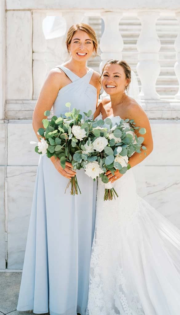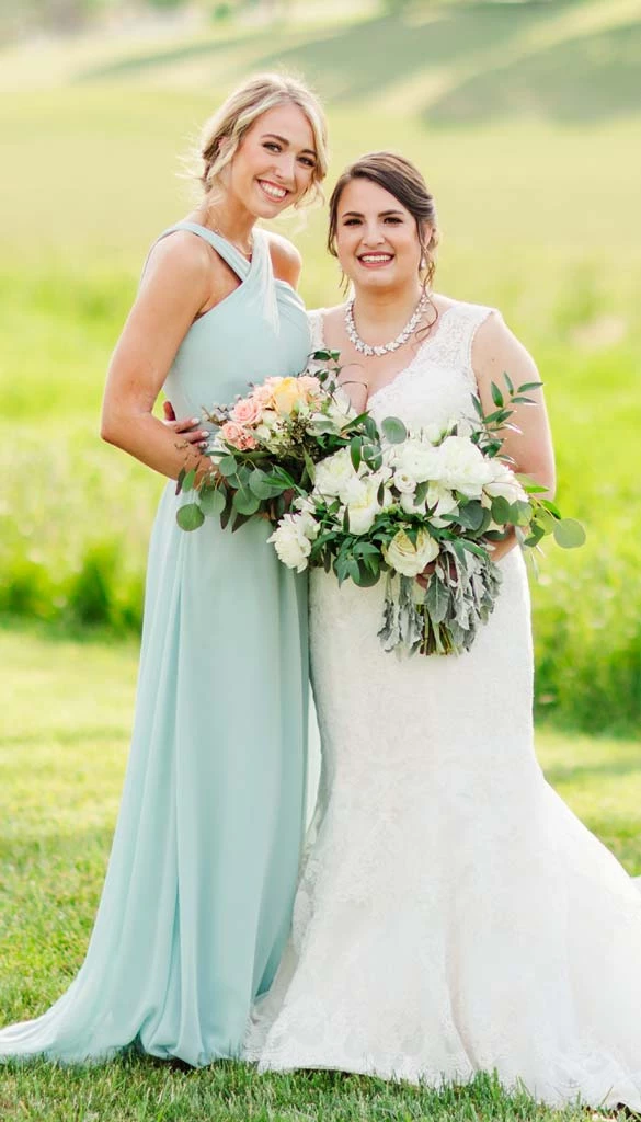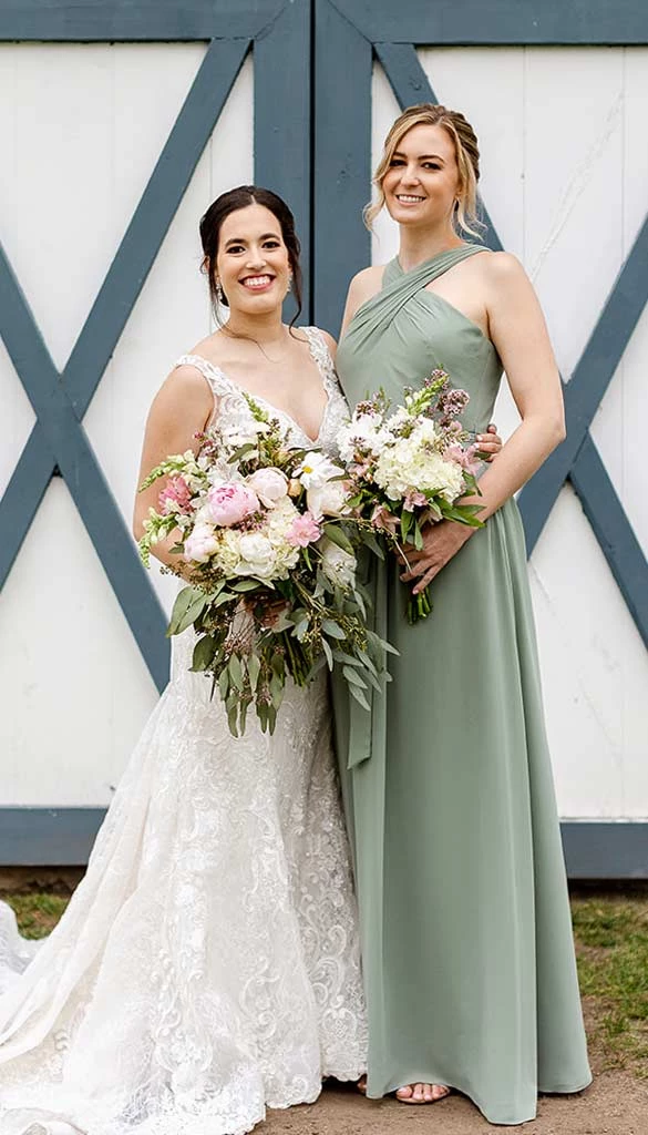 Elena is a bridesmaid favorite due to the comfortable criss-cross straps and universally flattering design. The relaxed skirt lends plenty of room for movement, while the removable self-tie sash allows you to create a more defined waistline. This modern style provides excellent coverage and will have every bridesmaid feeling beautiful throughout the big day!
