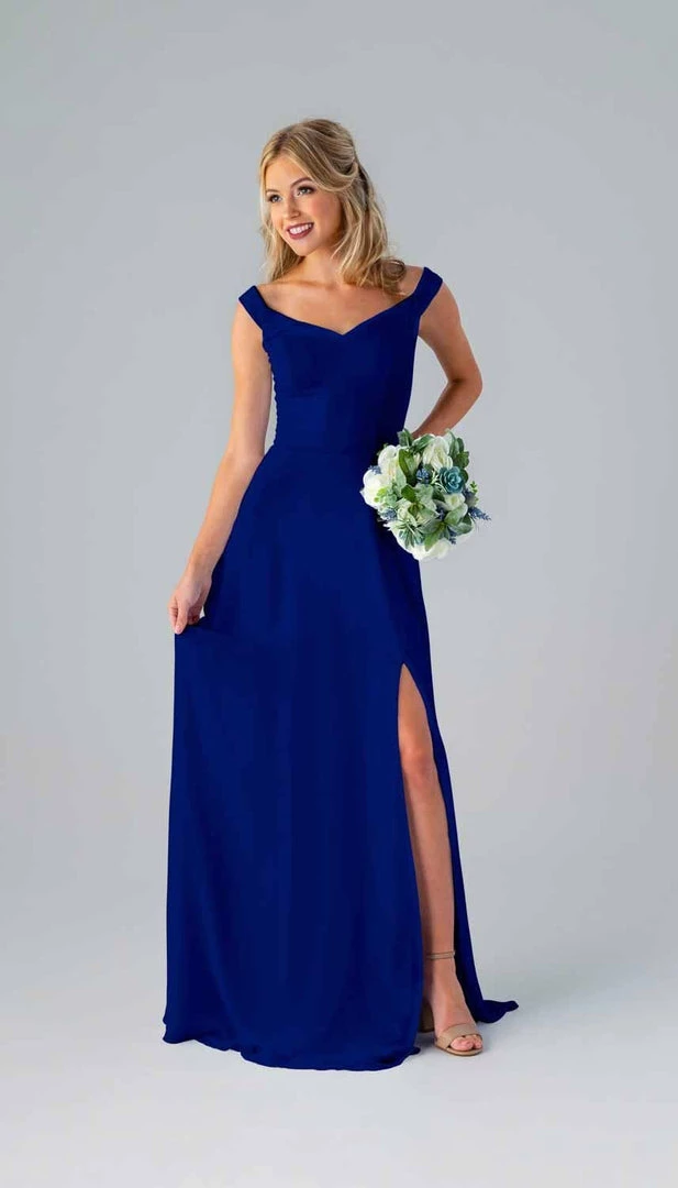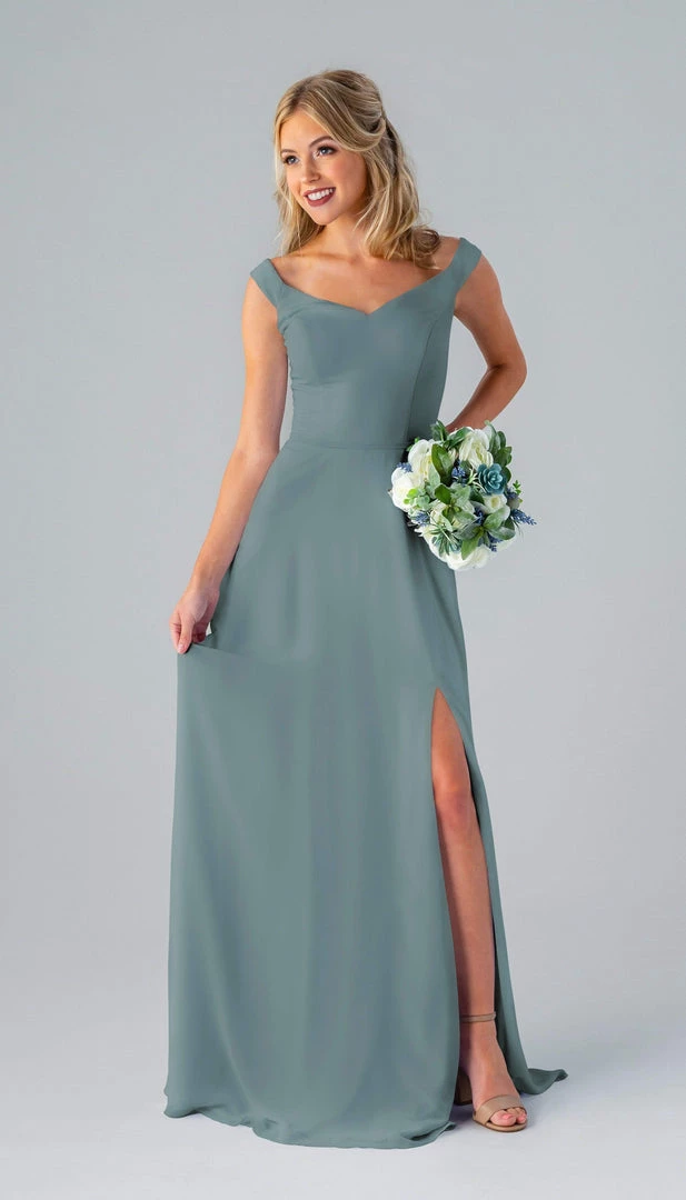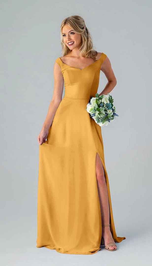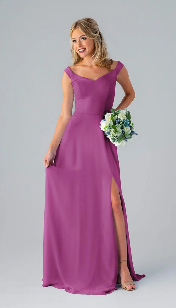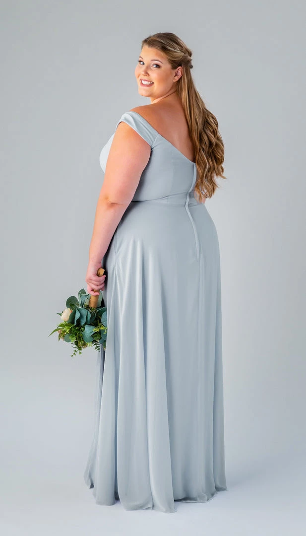 Haley is a timeless dress with a darling sweetheart neckline and classic slit in the skirt. Choose to wear the straps off-the-shoulder, or slide them up for more support. Featuring a swooping skirt, Haley keeps you comfortable as you support your favorite couple! Plus, this dress features pockets and a structured bodice to help you feel extra secure throughout the big day.