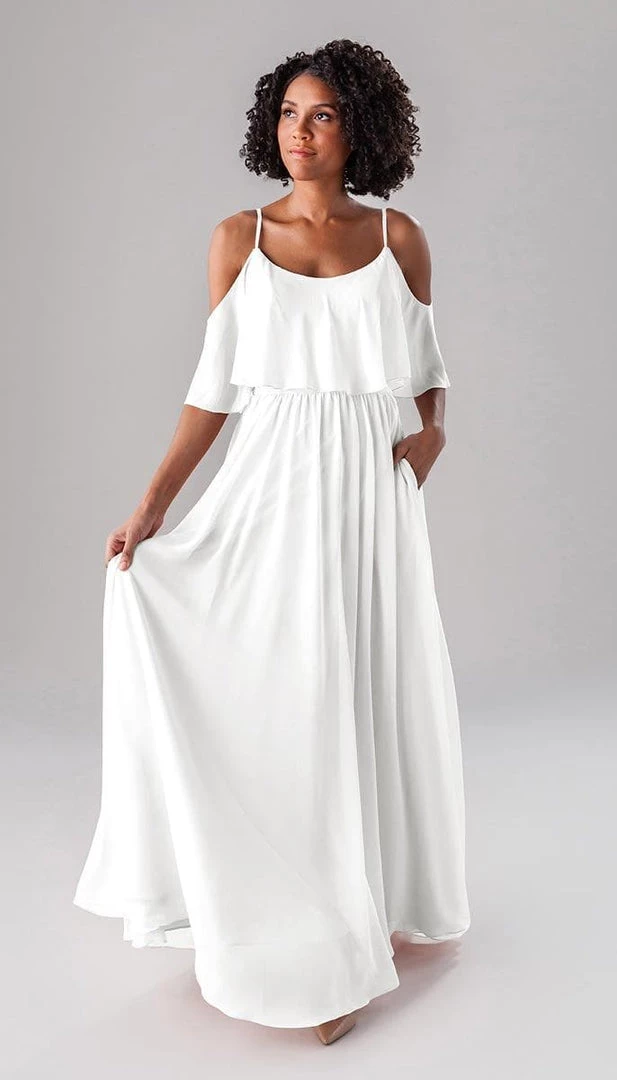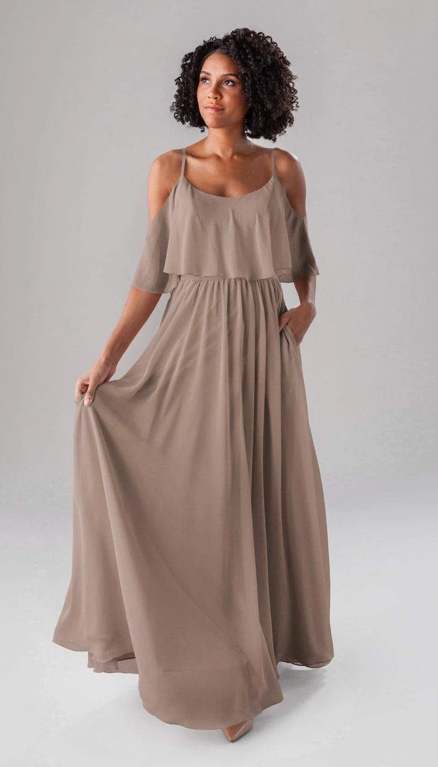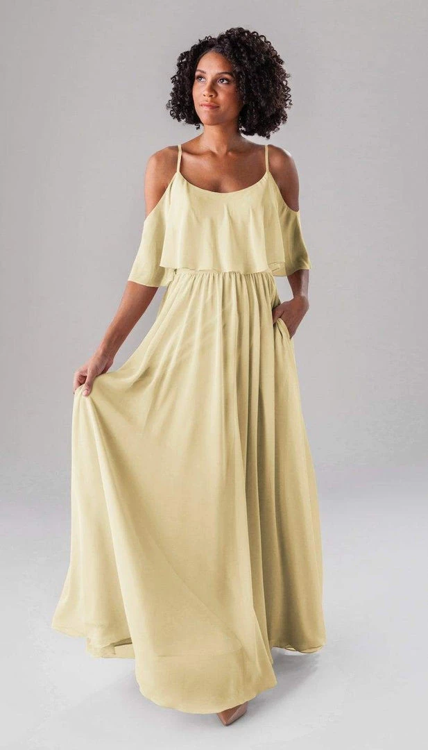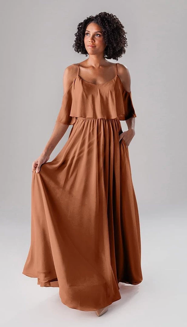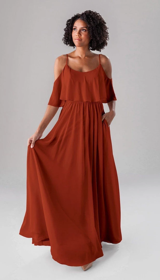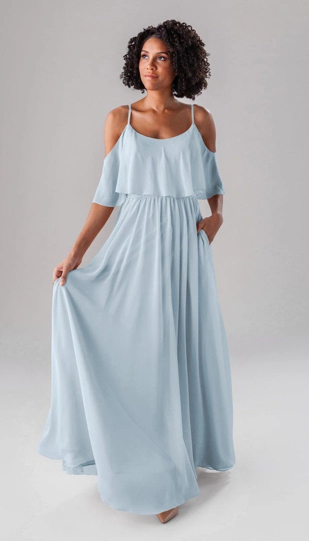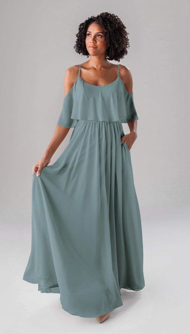 Nora is the perfect off-the-shoulder dress for the dreamy bridesmaid! This whimsical dress features a ruffled top, spaghetti straps, and an off the shoulder design, making this dress as comfortable as it is beautiful on everyone!