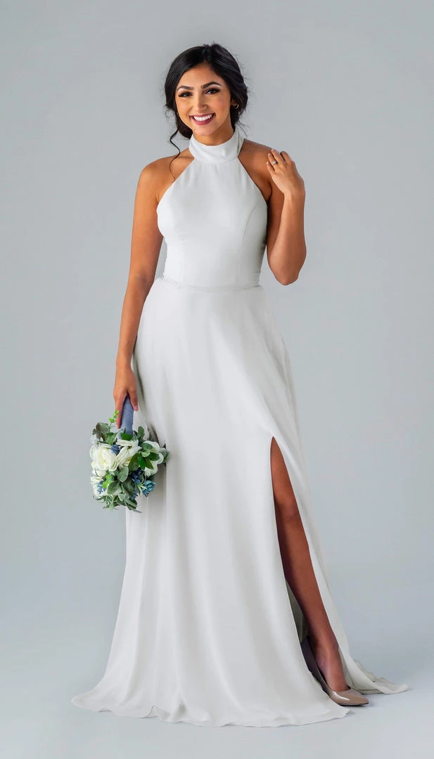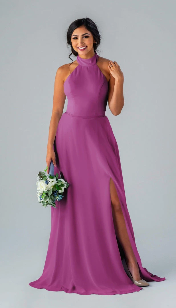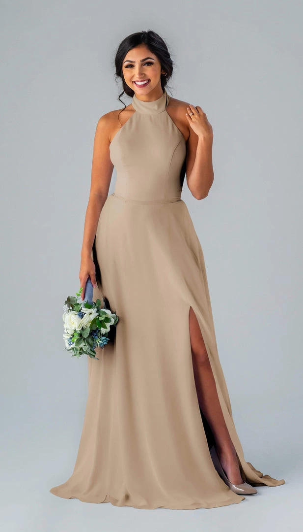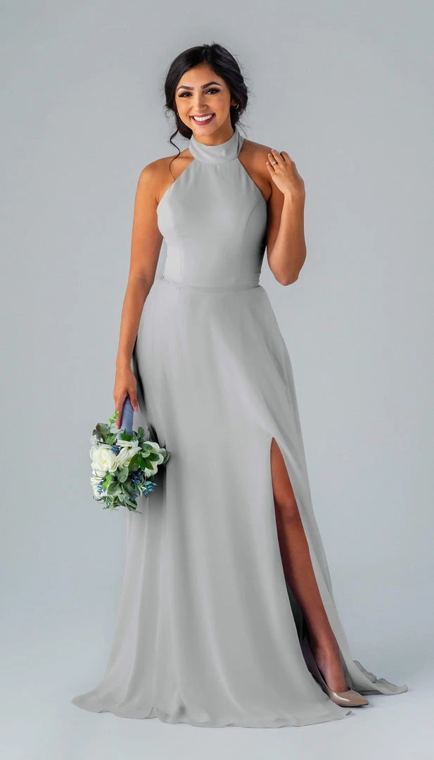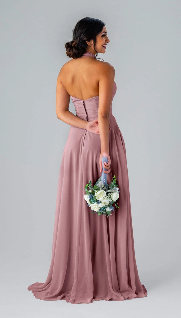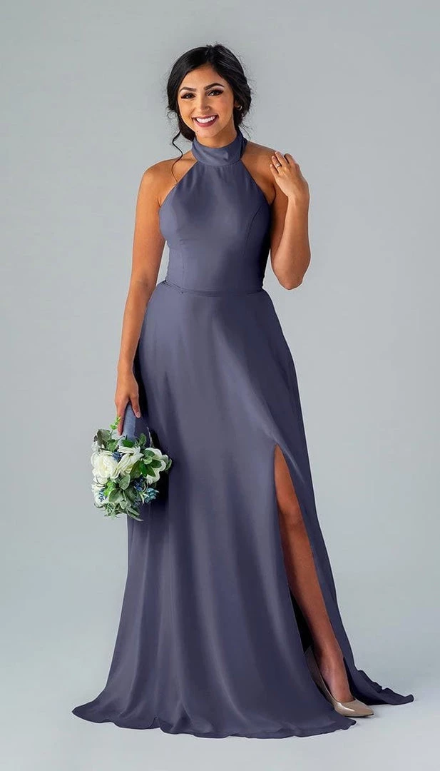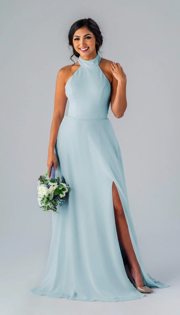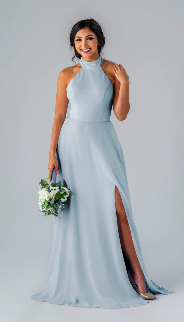 Kennedy Blue Stassi is a gorgeous and elegant high neck bridesmaid dress that features an open back and pockets. This flowy bridesmaid dress is flattering on a variety of figures.