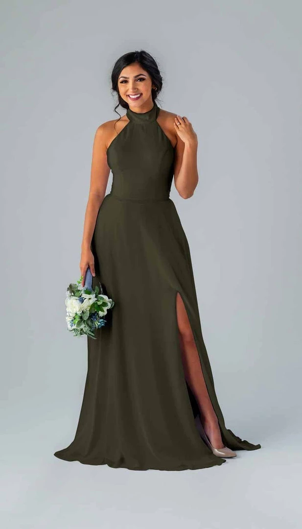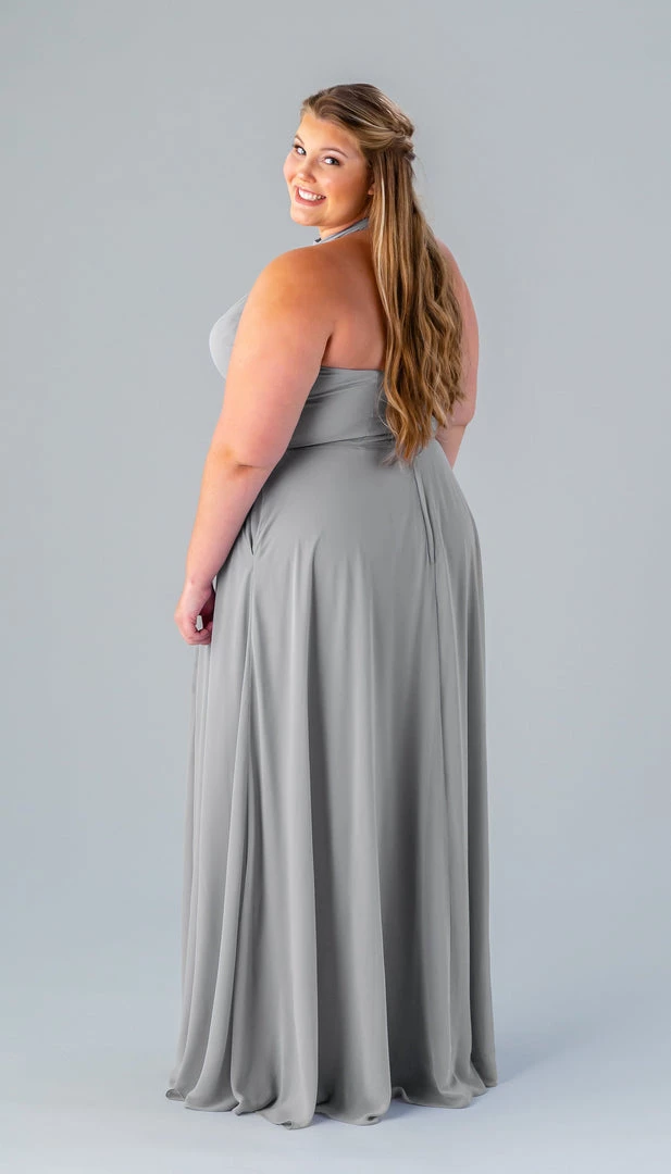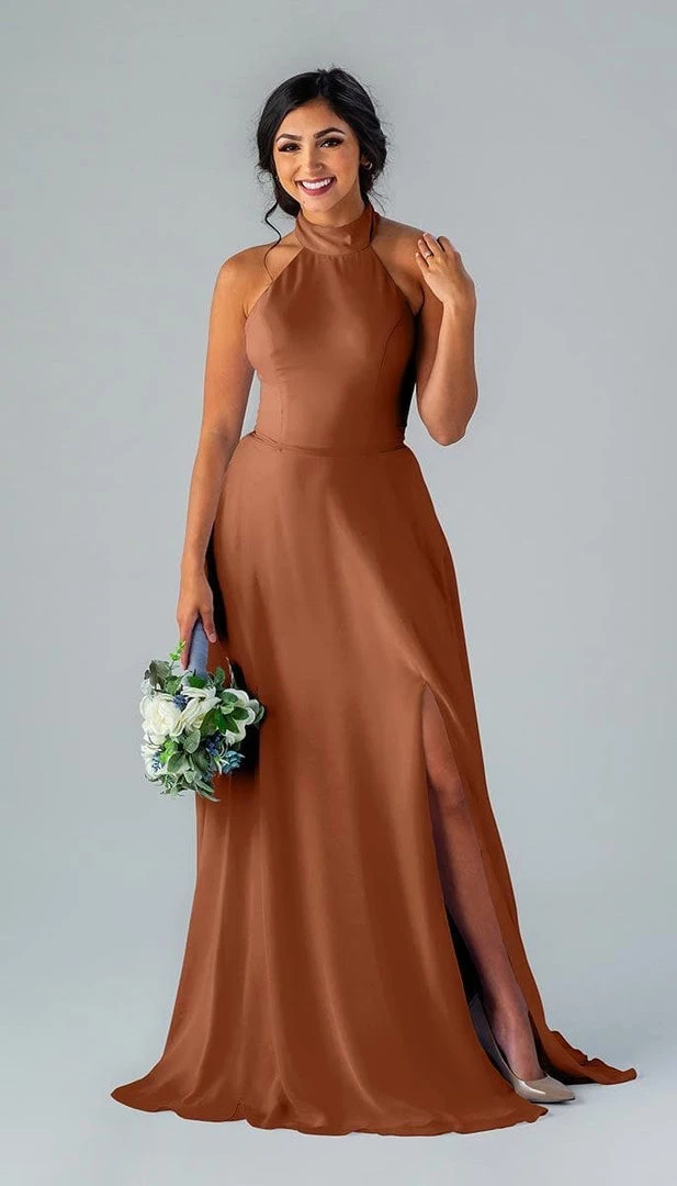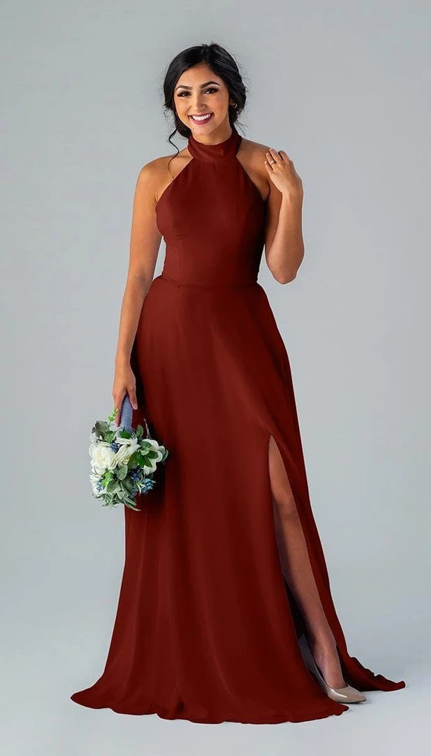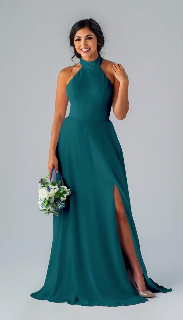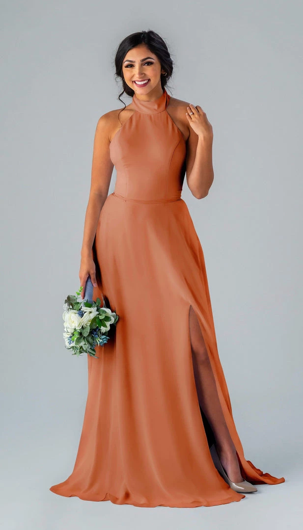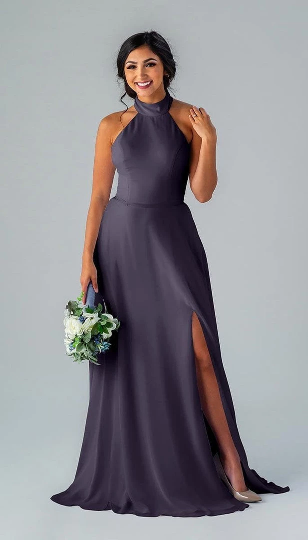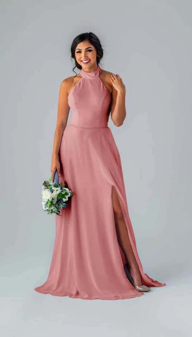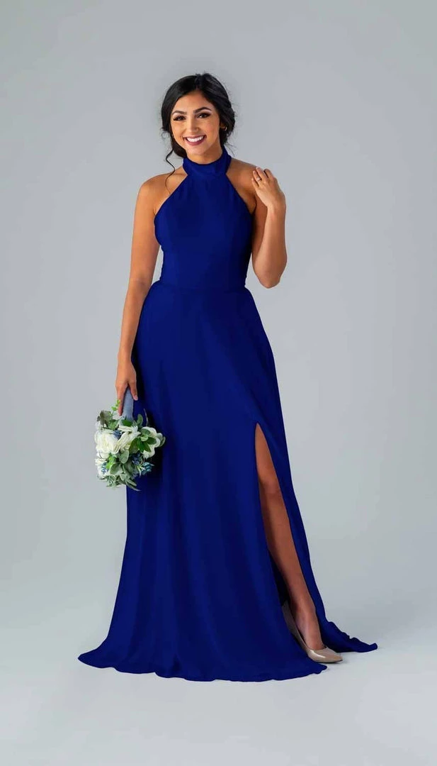 Kennedy Blue Stassi is a gorgeous and elegant high neck bridesmaid dress that features an open back and pockets. This flowy bridesmaid dress is flattering on a variety of figures.