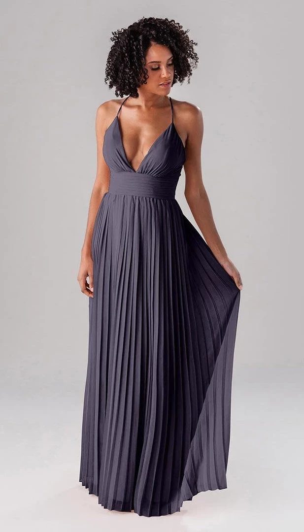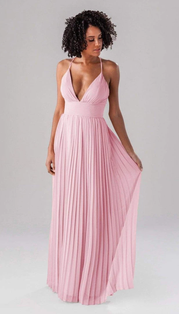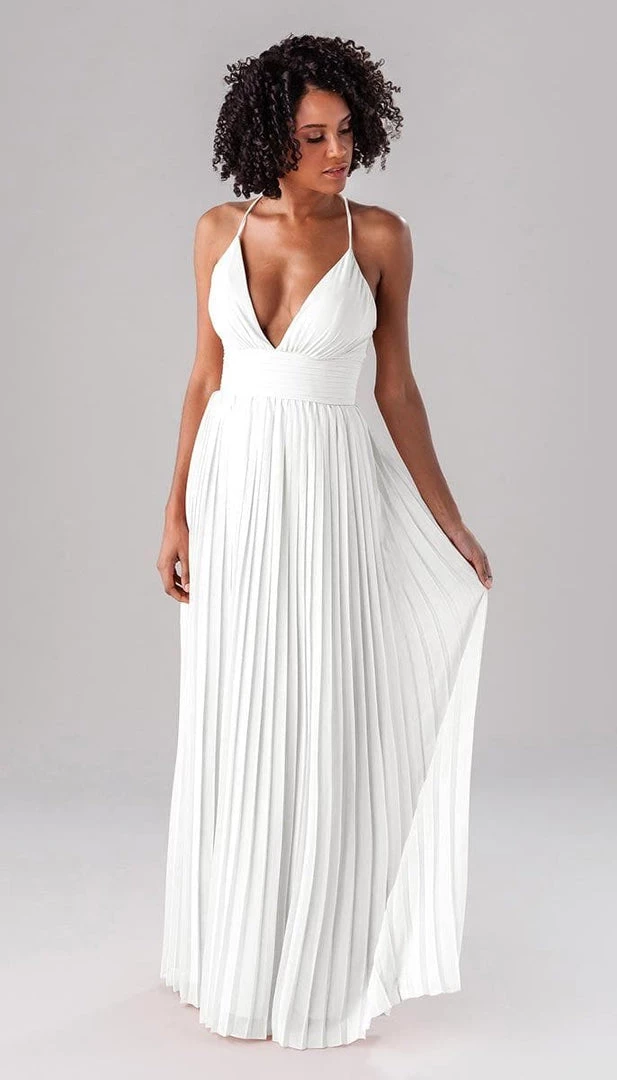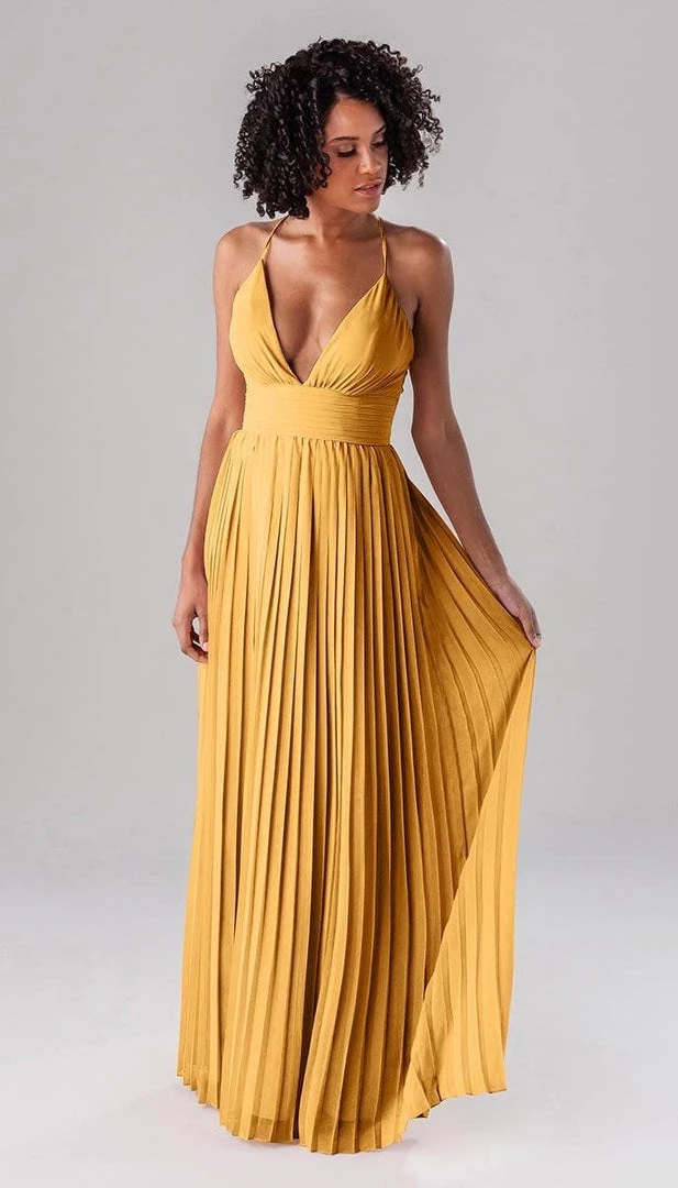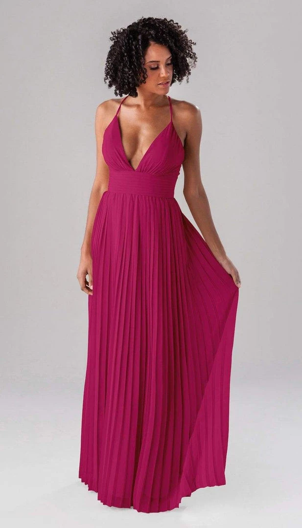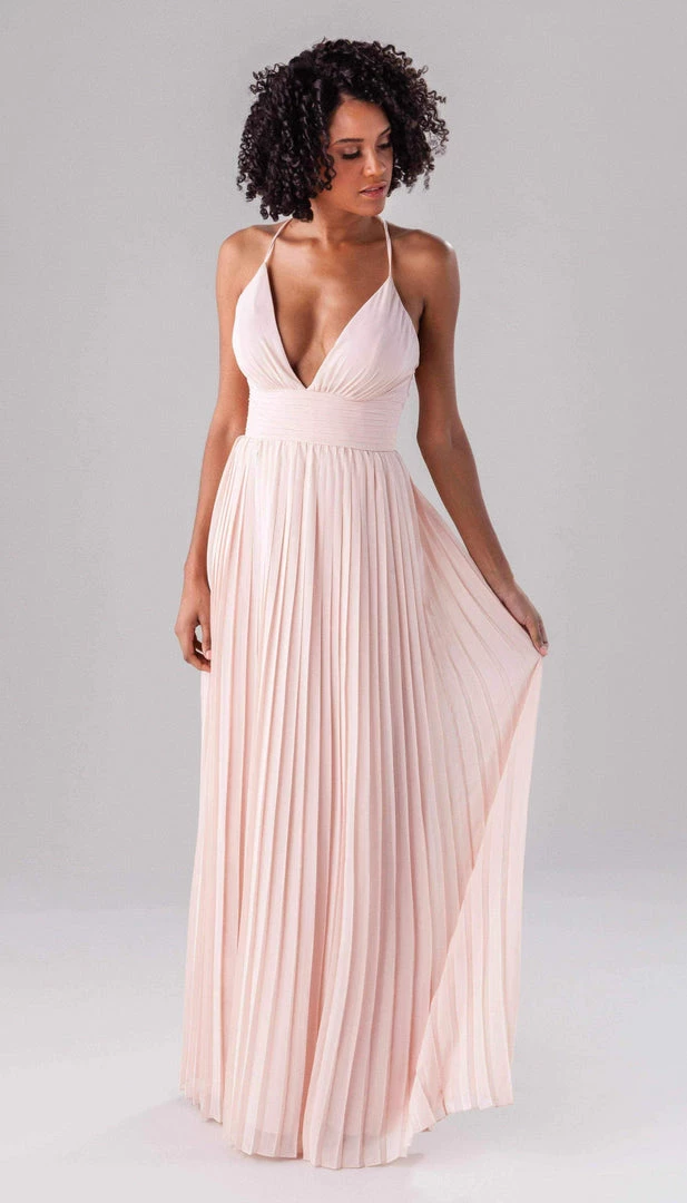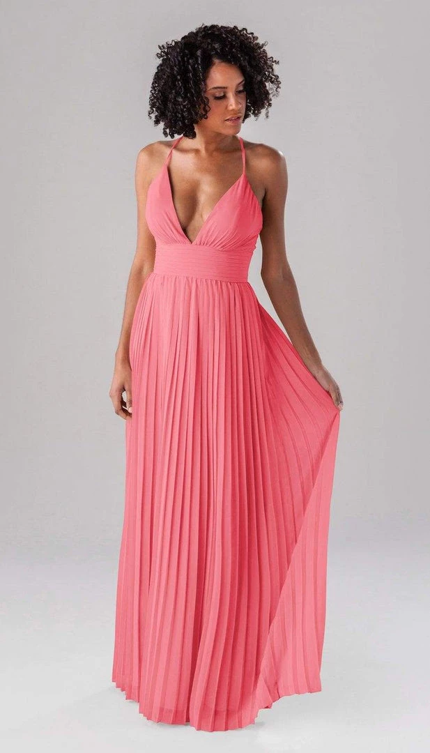 Summer is a modern bridesmaid dress that we promise the guests won’t forget about! Complete with an accordion chiffon skirt, a ruched top and waistband, and spaghetti straps, this deep plunge dress is one-of-a-kind show stopper!