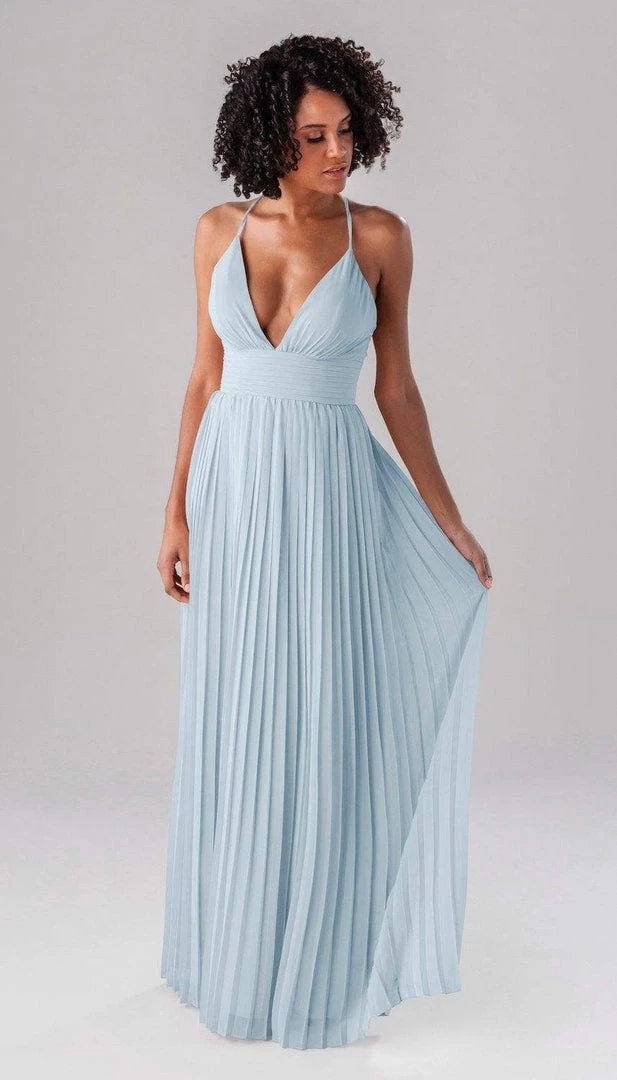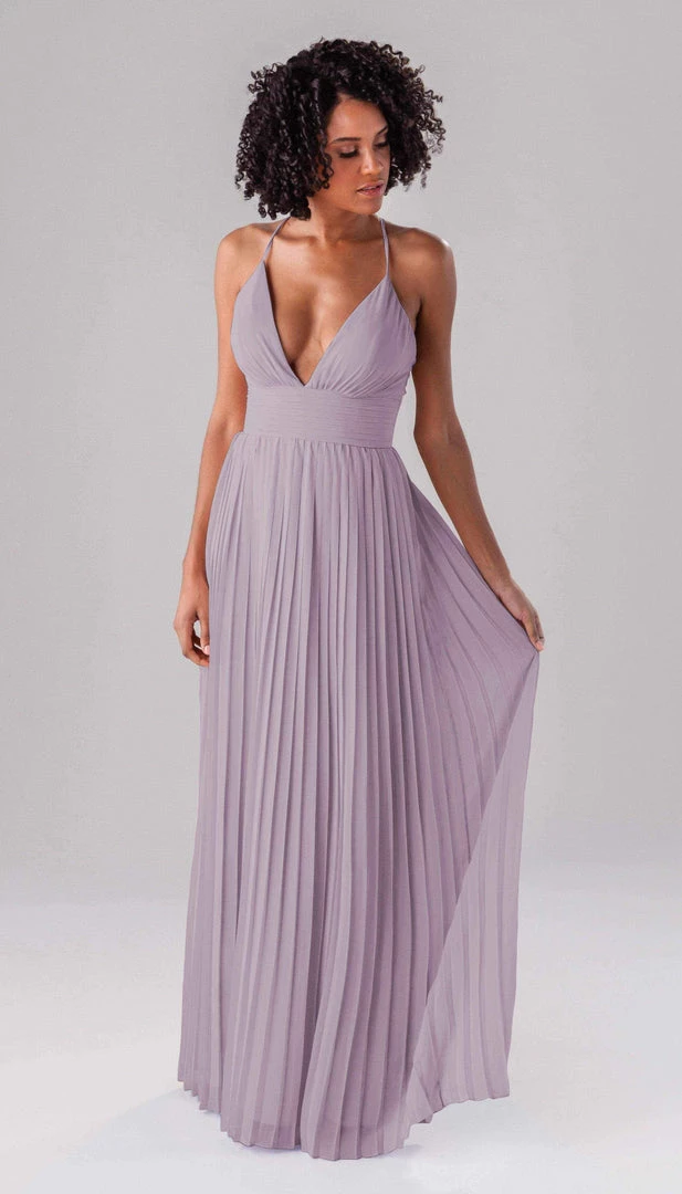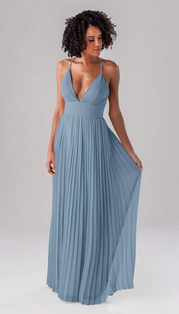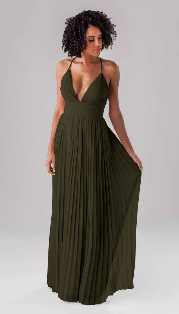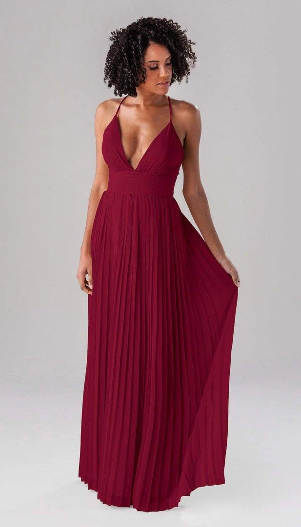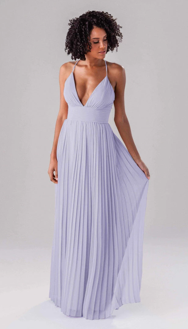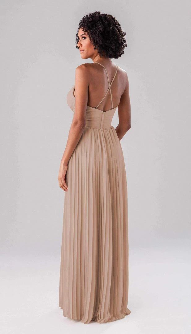 Summer is a modern bridesmaid dress that we promise the guests won’t forget about! Complete with an accordion chiffon skirt, a ruched top and waistband, and spaghetti straps, this deep plunge dress is one-of-a-kind show stopper!