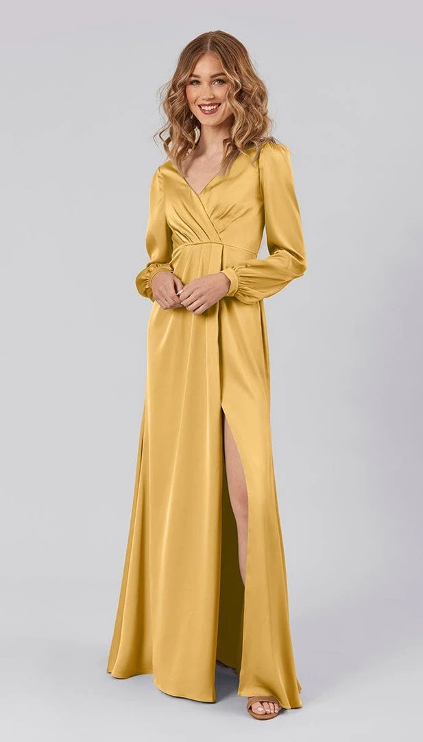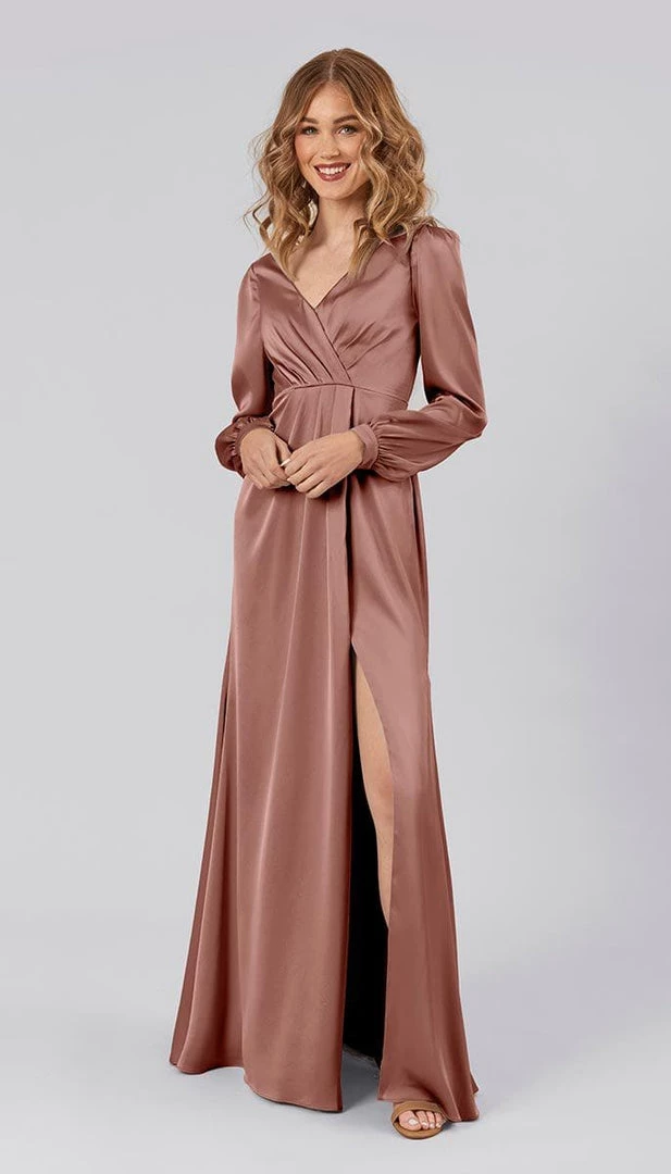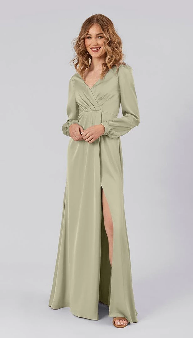 Tilda is the perfect bridesmaid dress for a modern wedding day! With its stunning long sleeves, covered back, and v neckline, Tilda is both modest and luxurious. The pleated skirt features a high slit that adds a flirty touch to this sophisticated gown. This affordable high quality satin dress is the perfect bridesmaids dress to enhance your wedding party look.