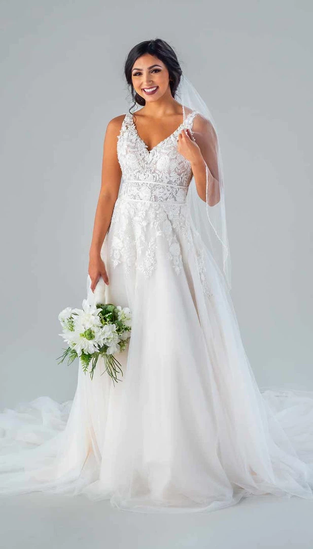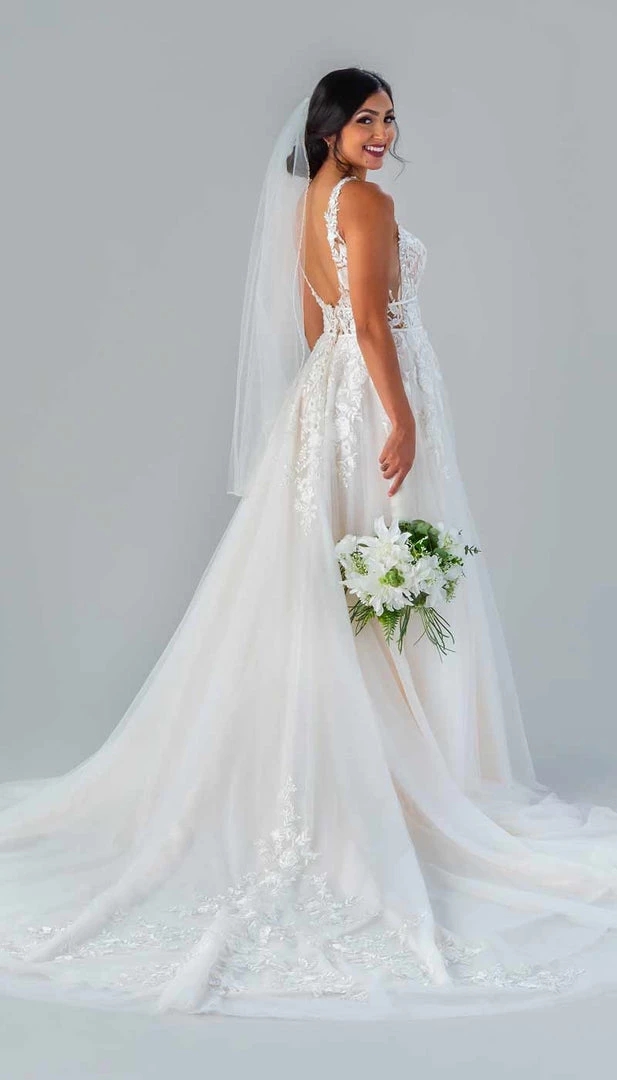Extra layers of tulle in the lined skirt add some fullness while the liner prevents the skirt from being see through. No slip needed! This wedding dress also has built in bra cups.