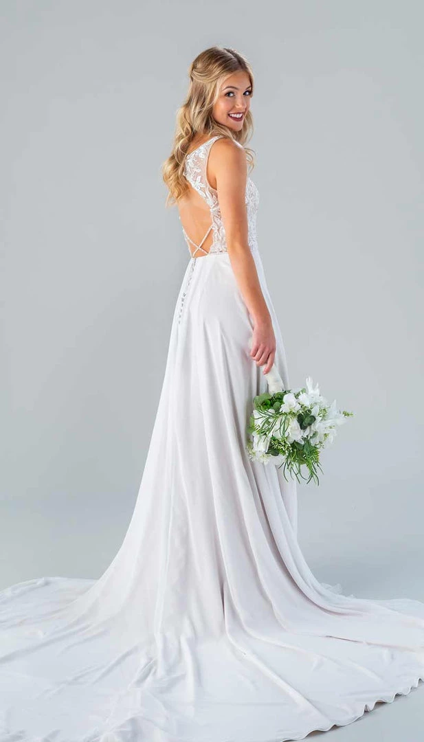 Built in bra cups and the lined skirt make it so you do not need to add undergarments to this lovely wedding dress.