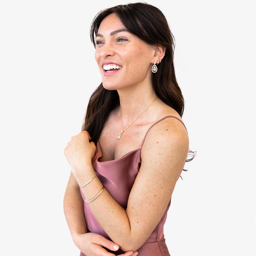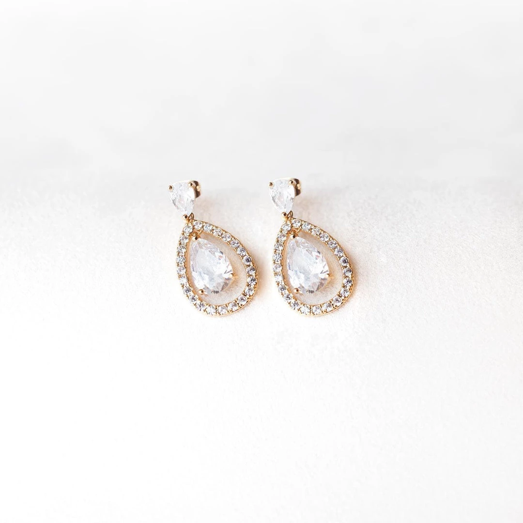 A breathtaking teardrop earring that exudes a striking look as you walk down the aisle. These gold earrings dazzle with cubic zirconia crystals, that would perfectly complement your bridal fashion wardrobe. This wedding jewelry is hypoallergenic and nickel free, while its gold-plated finish makes it incredibly tough and durable to last for a long time. These earrings pair with our Gold Tear Drop Necklace!Â