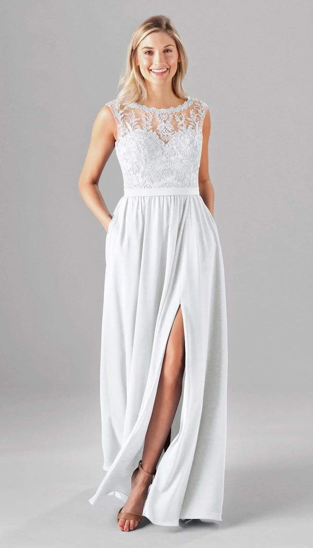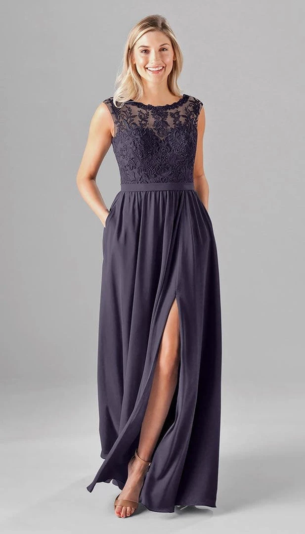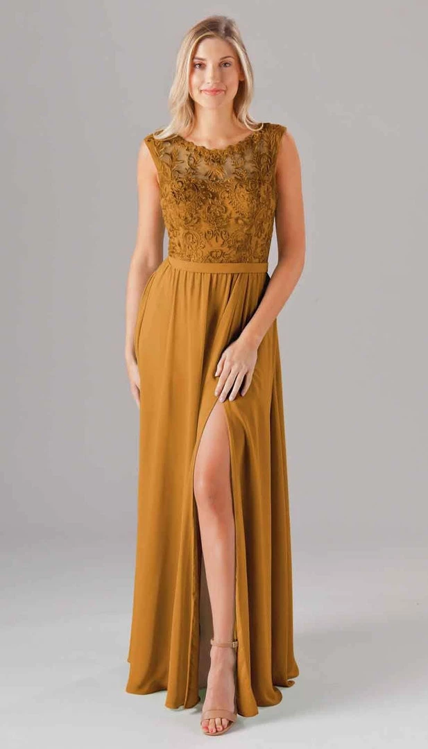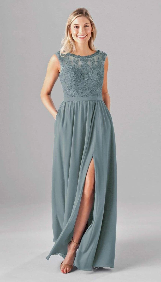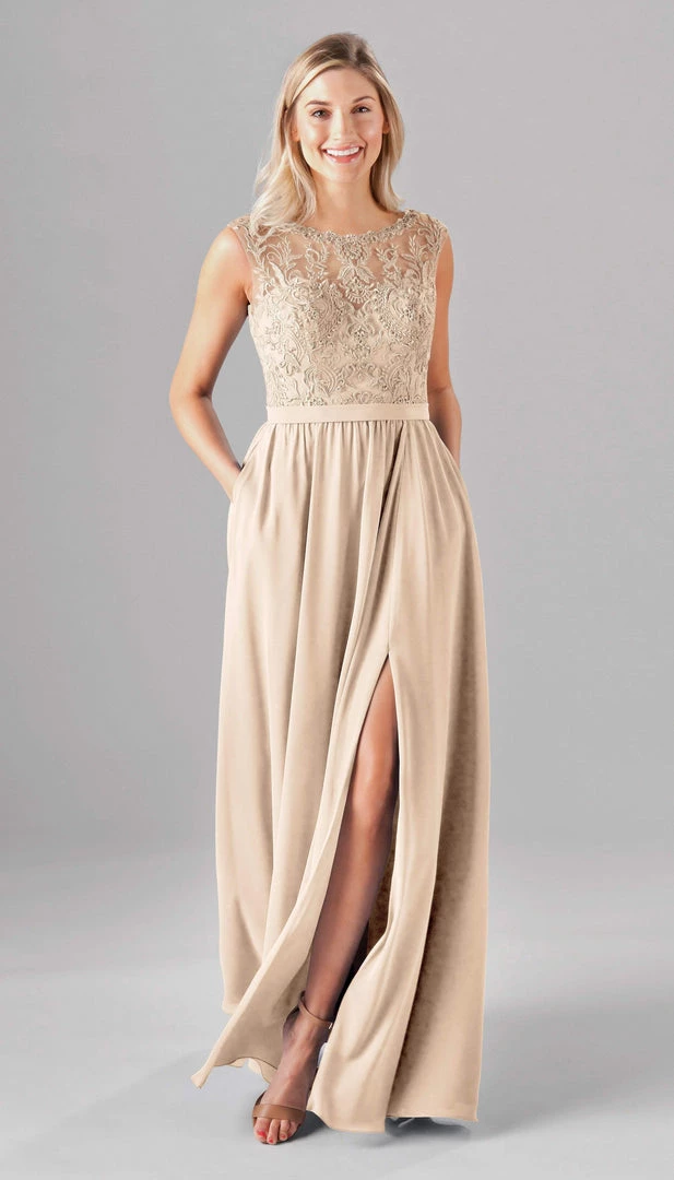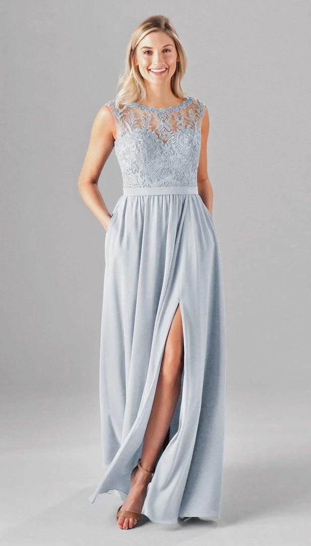 The gorgeous floral embroidered bodice on Jade, complete with the special detailing along the collarbone and v-back, make Jade a beautiful choice for your wedding. The high neck and slit on the skirt are classy and elegant. Mix and match Jade with other Kennedy Blue style dresses for a perfect mismatched bridal party!