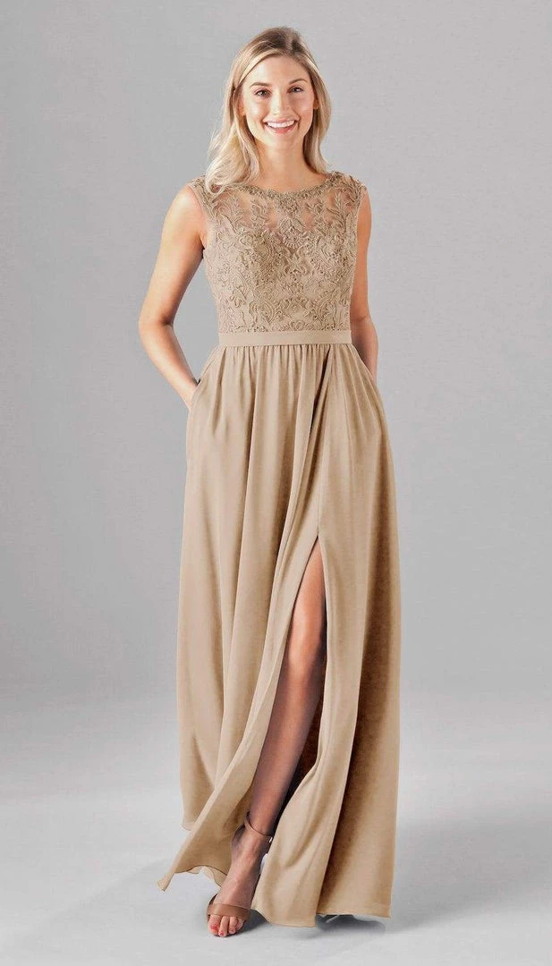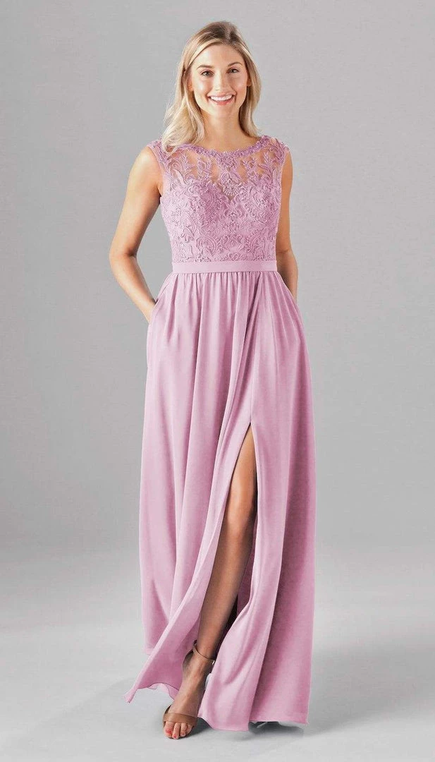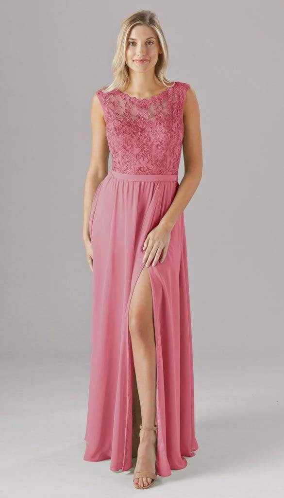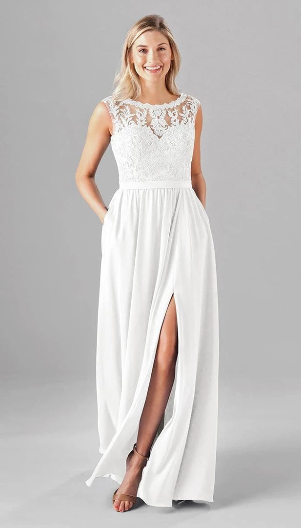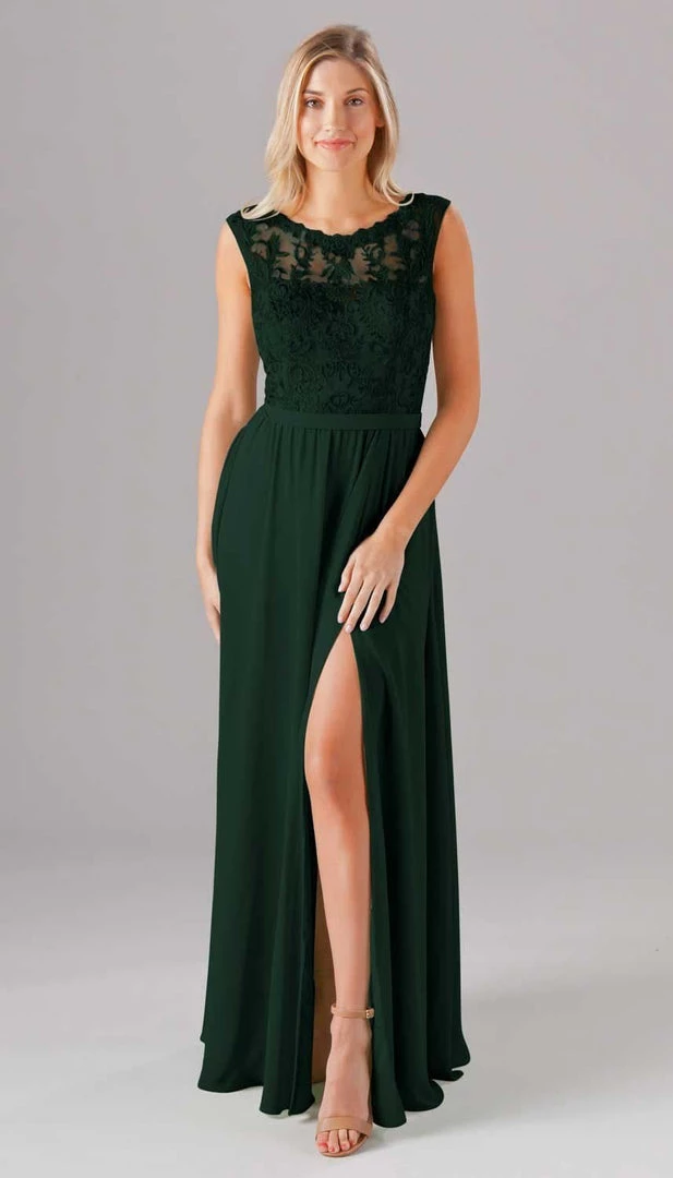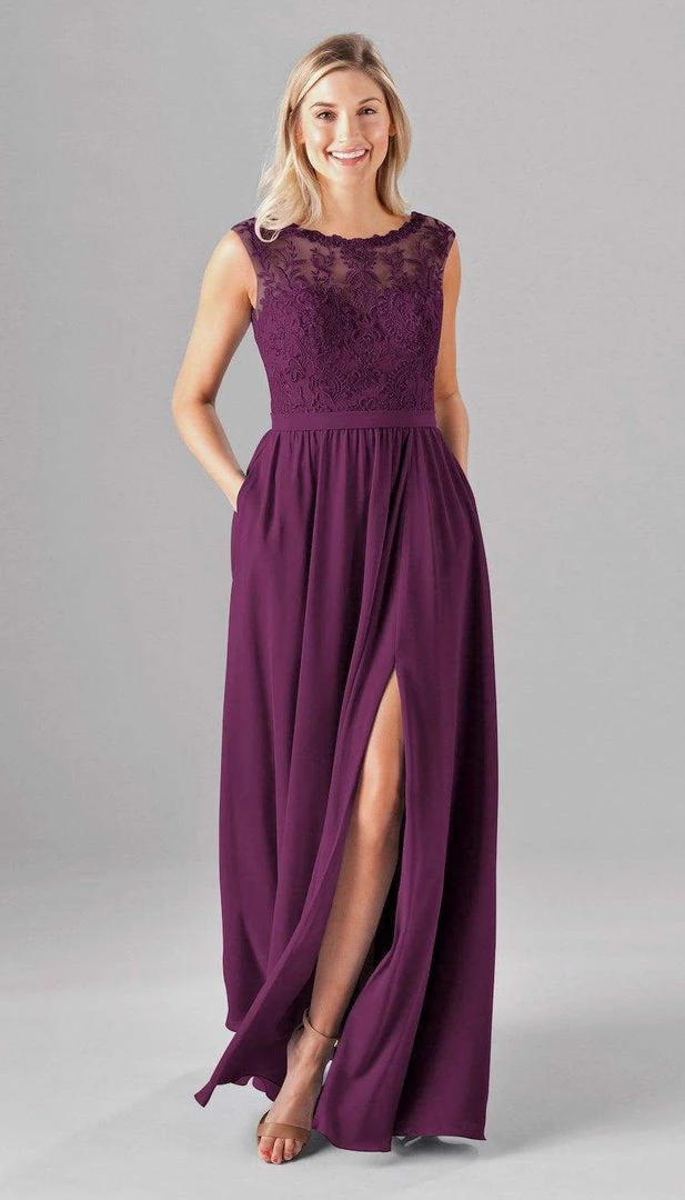 The gorgeous floral embroidered bodice on Jade, complete with the special detailing along the collarbone and v-back, make Jade a beautiful choice for your wedding. The high neck and slit on the skirt are classy and elegant. Mix and match Jade with other Kennedy Blue style dresses for a perfect mismatched bridal party!