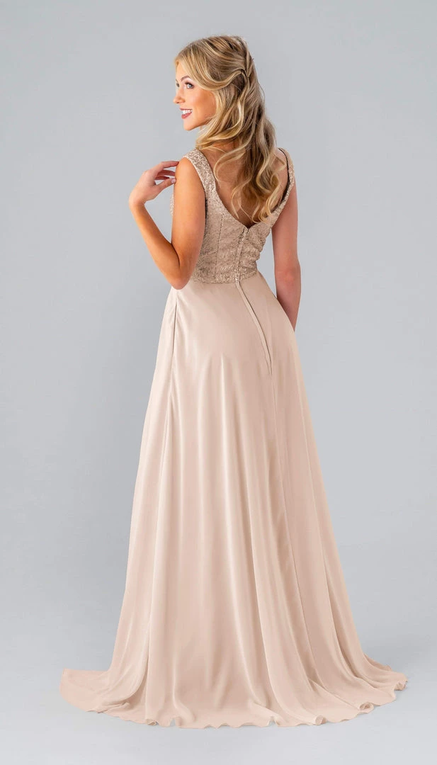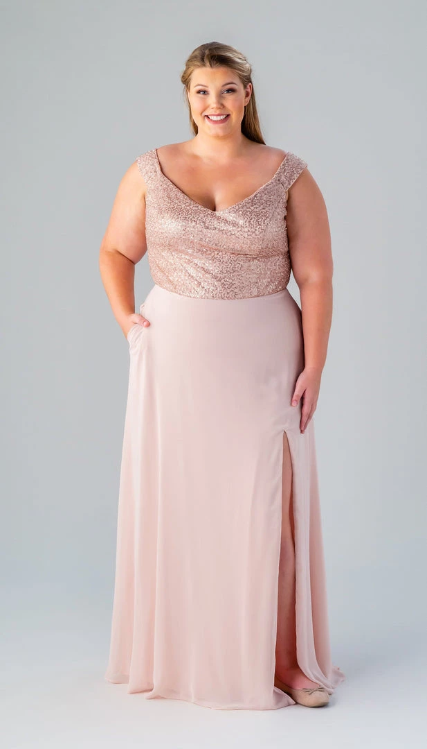 Kennedy Blue Noah is a flirty and chic bridesmaid gown that will be the perfect option for your bridal party. This dress features a sequin bodice with a sweetheart neckline and wide straps and an airy flat chiffon a-line skirt with a slit. This versatile dress will flatter a variety of figures.