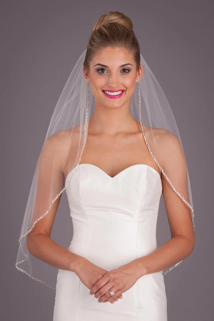 Look lovely on your wedding day wearing the beautiful Kennedy Blue Reagan veil. This medium length beaded wedding veil will leave you sparkling when you walk down the aisle.