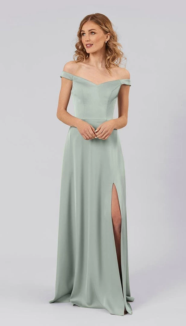 Arwen is a light weight high quality satin bridesmaids dress with a sassy slit, flowing a-line skirt, and romantic off the shoulder neckline. This silhouette is designed to flatter all shapes and sizes of bridesmaids. It is the perfect balance of class, sass, and style.