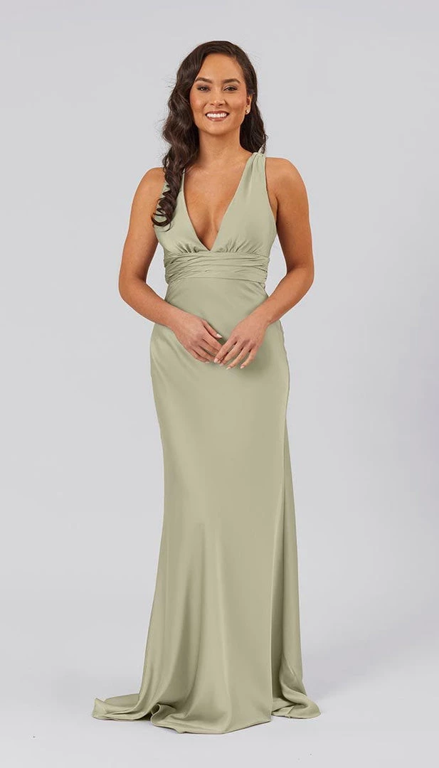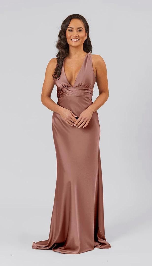 Emery is a modern and chic satin bridesmaids dress. This design is sleek, sexy and elegant. The high quality fabric you desire with the price you want. The dress features a plunging v-neckline, open v-back, defined waistline, fitted skirt, and crisscross back.