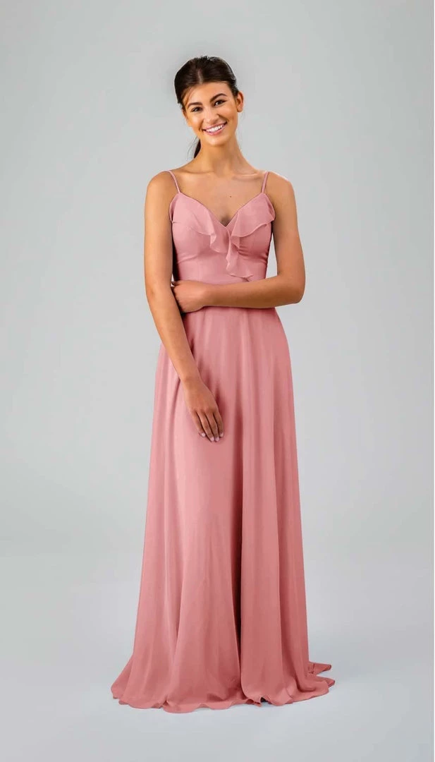 We’re feeling romantic! Emmy’s delicate ruffles and long, flowing skirt will have you floating down the aisle. With thin straps and a super cute V Back, this Kennedy Blue dress is sure to delight every bridesmaid!