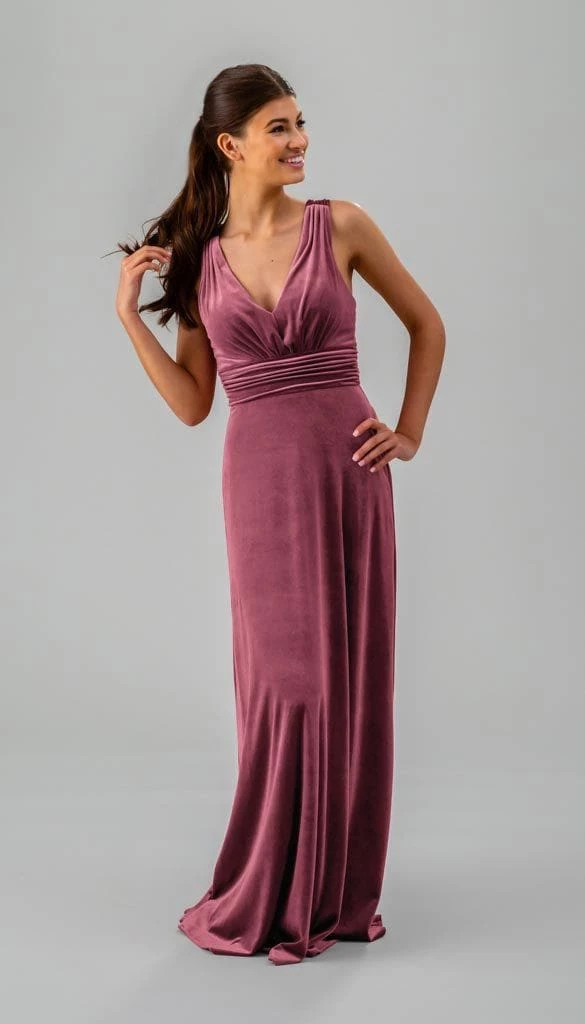Who says bridesmaid dresses have to be uncomfortable? Feel ultimate comfort in this Kennedy Blue velvet bridesmaid dress. Ruching and thick straps make this our most flattering velvet gown.