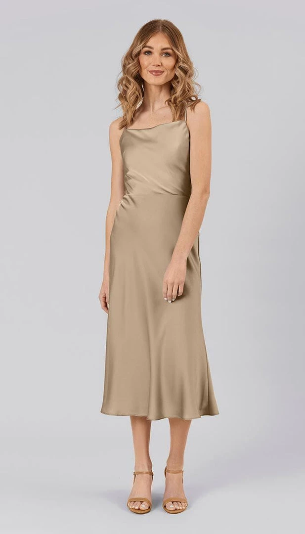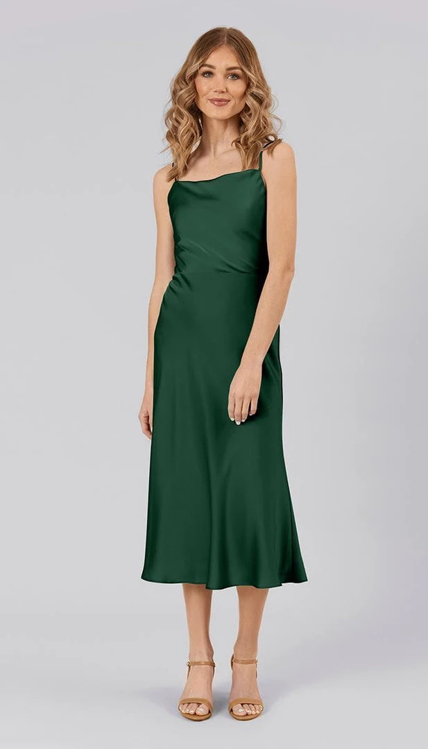 Kennedy Blue Kai is made from an affordable high quality satin that is sleek and vintage with a darling cowl neckline! Kennedy Blues’ new stain is lightweight and not overly shiny making it more luxurious. This dress also offers adjustable straps to cater to your body, provide comfort and the perfect adjustability for your needs. With this stylish midi fitted bridesmaid dress you wont need to worry about a hem!