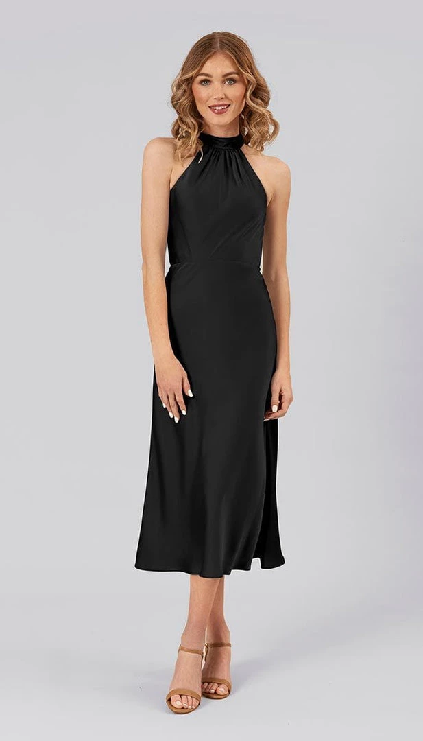 Kennedy Blues darling midi dress Rowen, is made from a high quality, affordable, and lightweight satin! This satin is not overly shiny giving it a more sophisticated and luxurious look. Rowens midi length and high neck detail is perfect for an elegant, sleek and modest look.