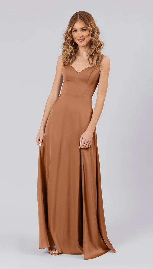 A minimal and classic dress, the Sabrina is a universally flattering bridesmaid option. With a sweetheart neckline, and flowing a-line skirt and slit. This dress also features subtle pockets in the skirt! This dress is cut for superior comfort in our new high quality and lightweight satin fabric!