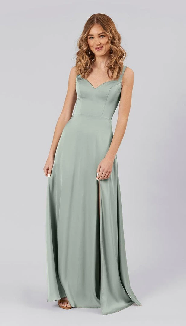A minimal and classic dress, the Sabrina is a universally flattering bridesmaid option. With a sweetheart neckline, and flowing a-line skirt and slit. This dress also features subtle pockets in the skirt! This dress is cut for superior comfort in our new high quality and lightweight satin fabric!