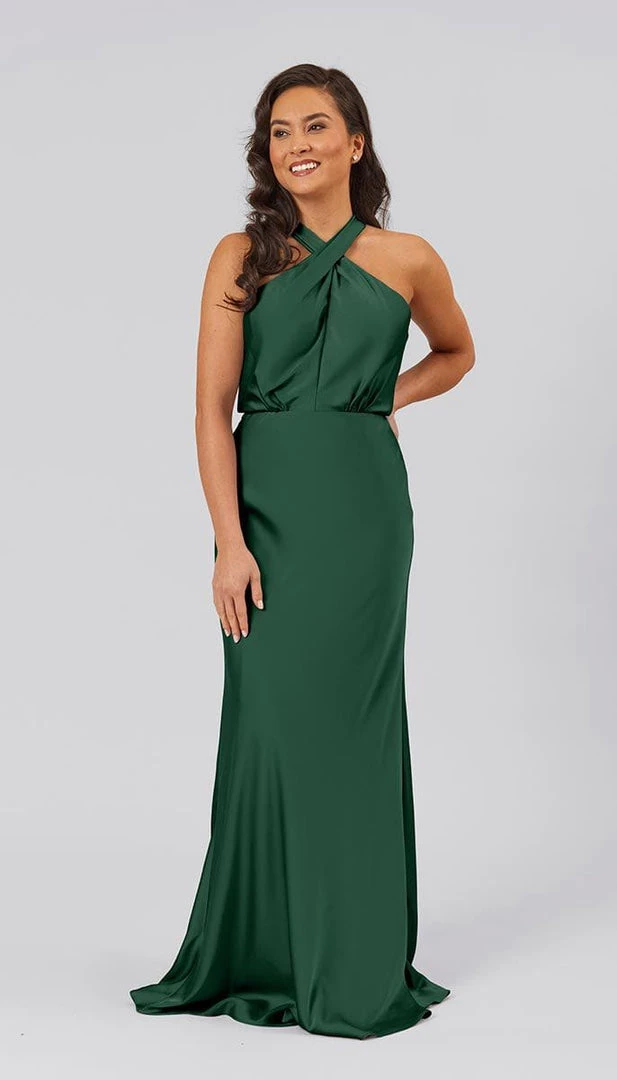 The perfect bridesmaids dress for a chic and classy bridal party, this high quality satin gown is affordable and features intricate detailing. It features a crisscross high neckline, keyhole back and fitted skirt. Zara is an effortless choice for bridesmaids.
