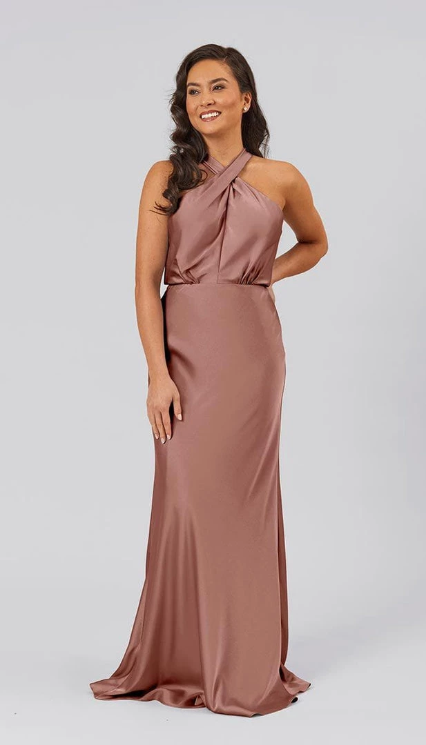 The perfect bridesmaids dress for a chic and classy bridal party, this high quality satin gown is affordable and features intricate detailing. It features a crisscross high neckline, keyhole back and fitted skirt. Zara is an effortless choice for bridesmaids.