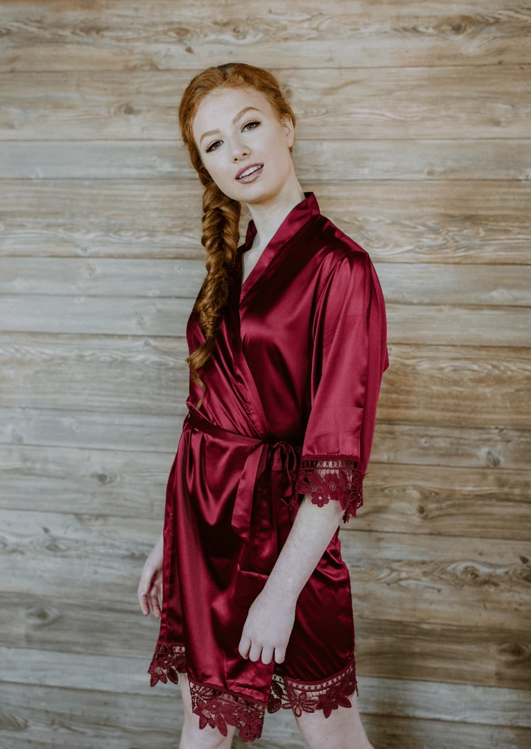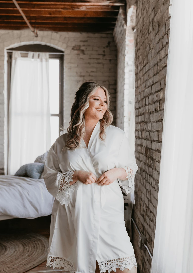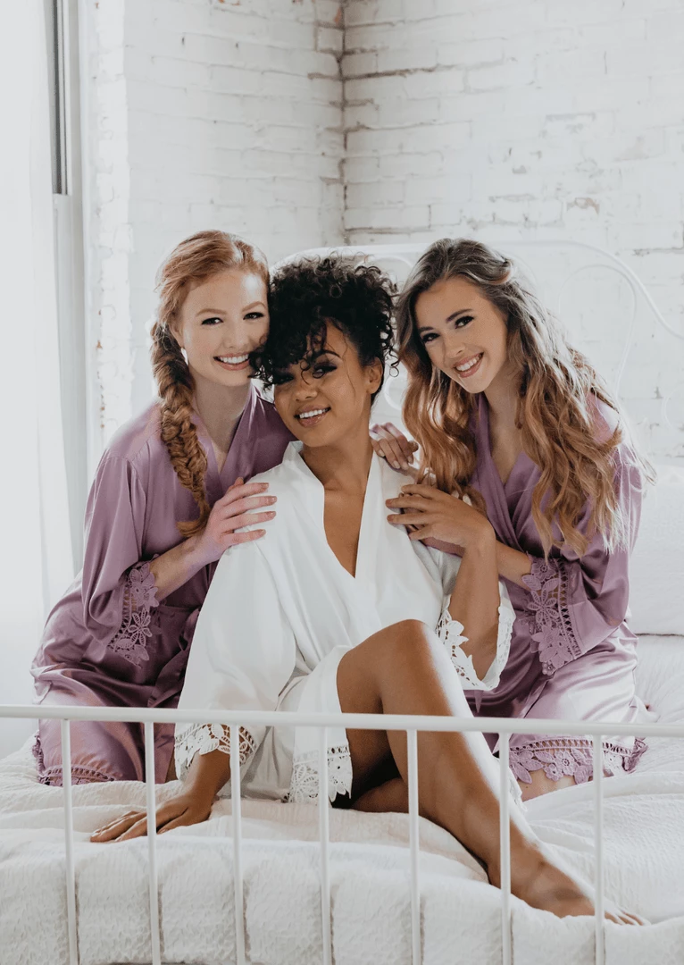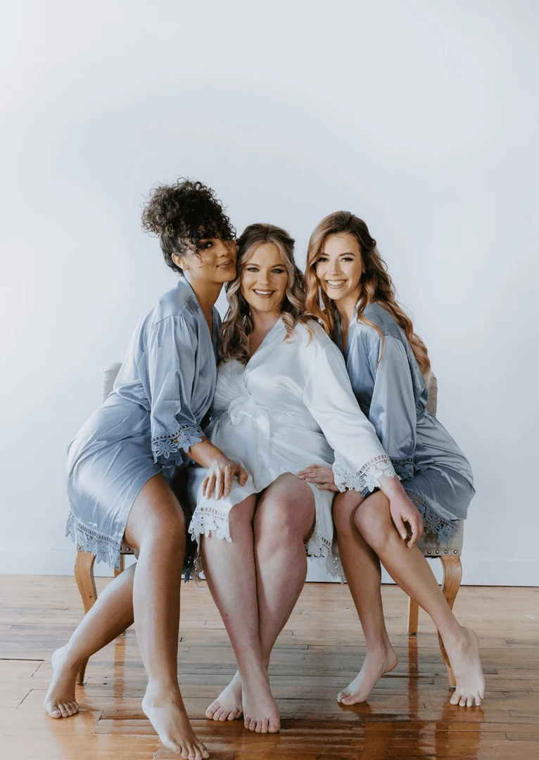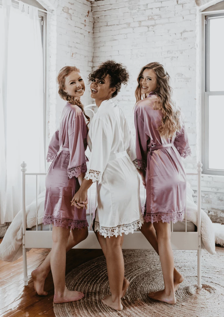 Everyone will be moving around prepping & doing makeup/hair. Our robes are lightweight satin and lace. This makes them cool and comfortable. Since you will be on the move, we designed these wrap-style robes with a tie belt to help keep the robe secured.