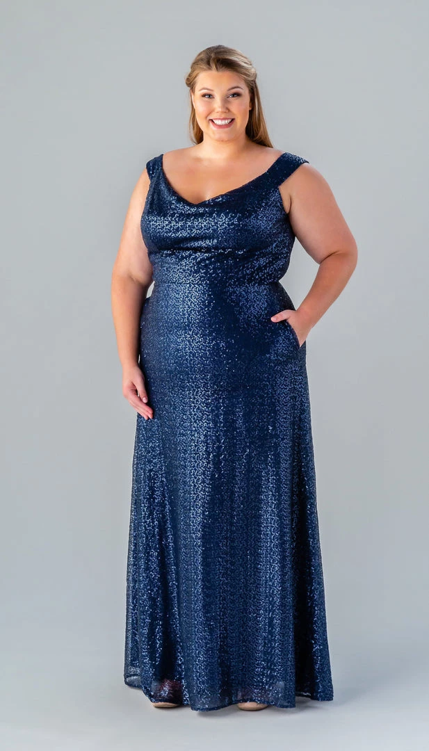 Kennedy Blue Sawyer is a gorgeous and elegant sequin bridesmaid dress that features a sweetheart neckline, an elegant off the shoulder look, and pockets. This sequin bridesmaid dress is flattering on a variety of figures.