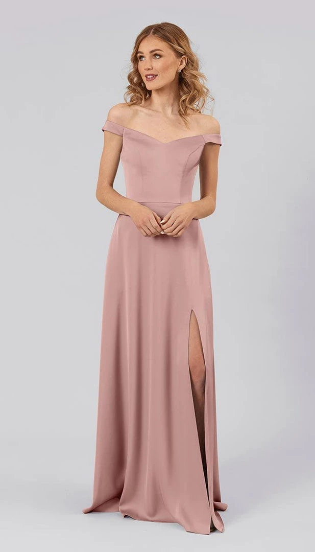 Arwen is a light weight high quality satin bridesmaids dress with a sassy slit, flowing a-line skirt, and romantic off the shoulder neckline. This silhouette is designed to flatter all shapes and sizes of bridesmaids. It is the perfect balance of class, sass, and style.