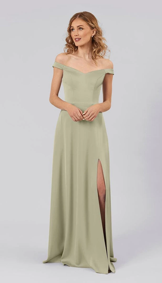 Arwen is a light weight high quality satin bridesmaids dress with a sassy slit, flowing a-line skirt, and romantic off the shoulder neckline. This silhouette is designed to flatter all shapes and sizes of bridesmaids. It is the perfect balance of class, sass, and style.
