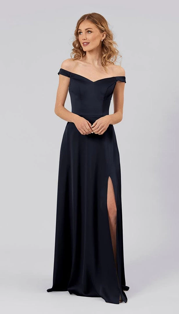 Arwen is a light weight high quality satin bridesmaids dress with a sassy slit, flowing a-line skirt, and romantic off the shoulder neckline. This silhouette is designed to flatter all shapes and sizes of bridesmaids. It is the perfect balance of class, sass, and style.