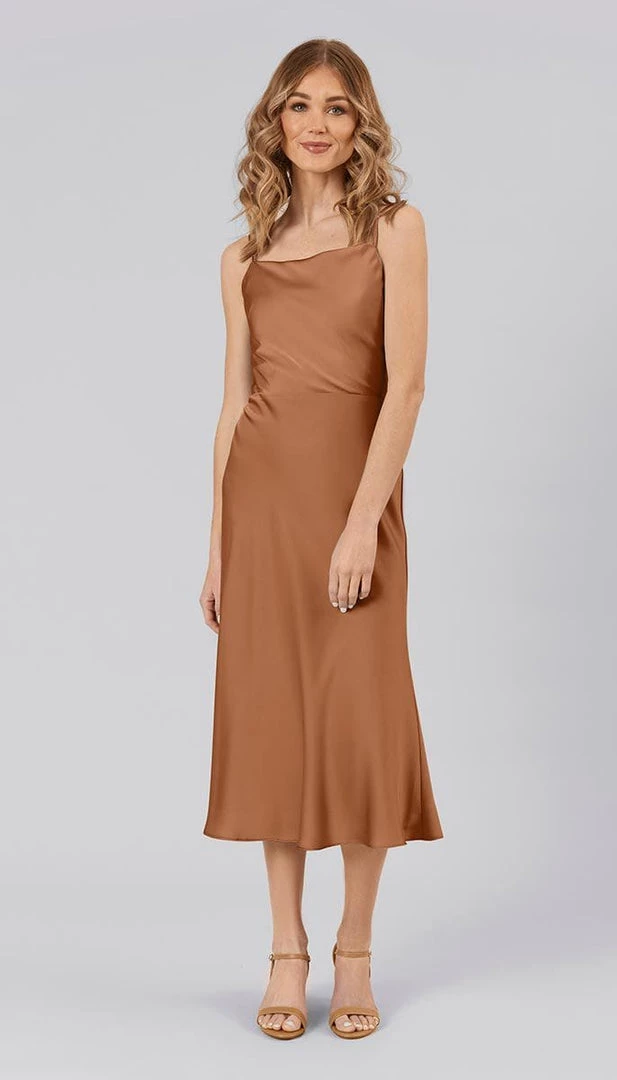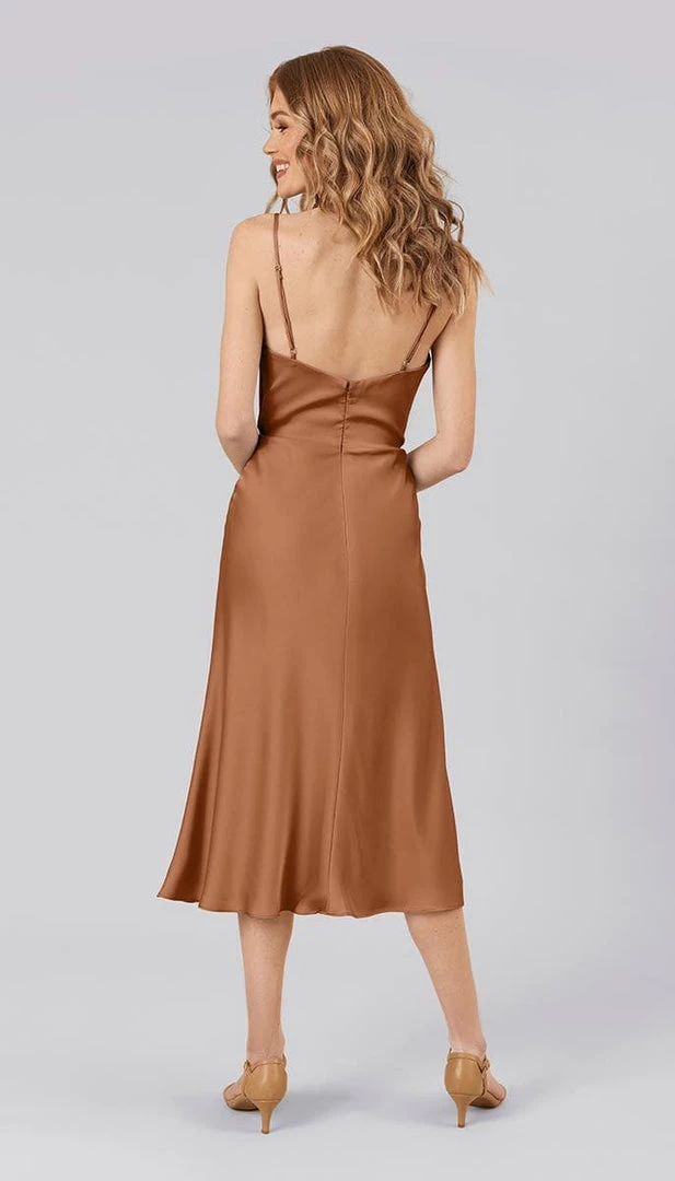 Kennedy Blue Kai is made from an affordable high quality satin that is sleek and vintage with a darling cowl neckline! Kennedy Blues’ new stain is lightweight and not overly shiny making it more luxurious. This dress also offers adjustable straps to cater to your body, provide comfort and the perfect adjustability for your needs. With this stylish midi fitted bridesmaid dress you wont need to worry about a hem!Â