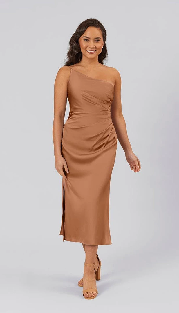This one shoulder bridesmaids dress is modern and flirty. The light weight high quality satin fabric contours to your form, allowing the dress to gracefully flow all around. The adjustable strap and midi length means it fits perfectly, creating modern elegance for any wedding day. This dress is great because it’s both adorable and affordable.Â
