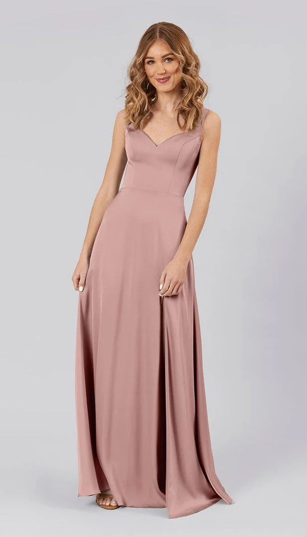 A minimal and classic dress, the Sabrina is a universally flattering bridesmaid option. With a sweetheart neckline, and flowing a-line skirt and slit. This dress also features subtle pockets in the skirt! This dress is cut for superior comfort in our new high quality and lightweight satin fabric!