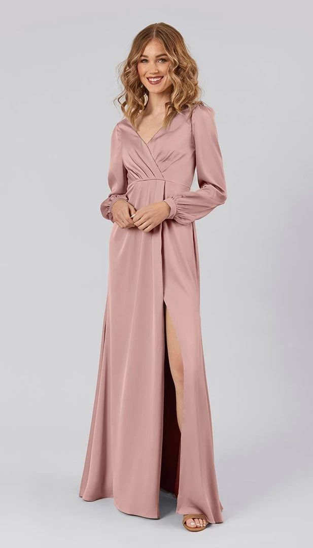 Tilda is the perfect bridesmaid dress for a modern wedding day! With its stunning long sleeves, covered back, and v neckline, Tilda is both modest and luxurious. The pleated skirt features a high slit that adds a flirty touch to this sophisticated gown. This affordable high quality satin dress is the perfect bridesmaids dress to enhance your wedding party look.