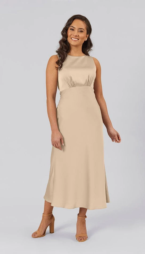 Wendy is a gorgeous dress in stunning high quality, lightweight satin that is vintage-inspired and brimming with elegance. Features include a high neck, keyhole back, and a more modern, fun midi length.